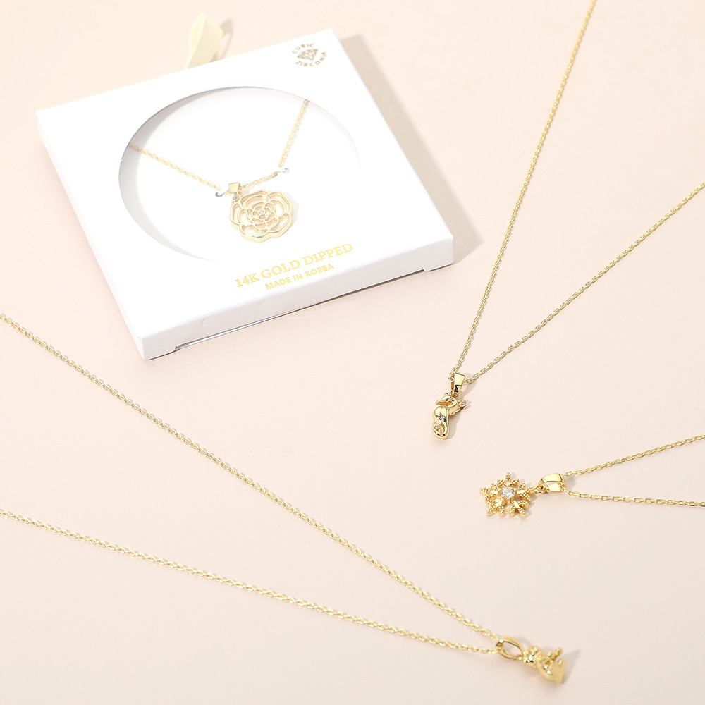 Details • Necklace Size : 16" + 2" L • Pendant Size : 0.7" X 0.75" • Bring timeless beauty to your style with this rose pendant necklace, featuring a luminous inlay framed in delicate petal outlines and accented with a central sparkle. A graceful accessory that blends elegance and charm, perfect for gifting or everyday sophistication. • CZ Cubic Zirconia • Gold Dipped • Made In Korea