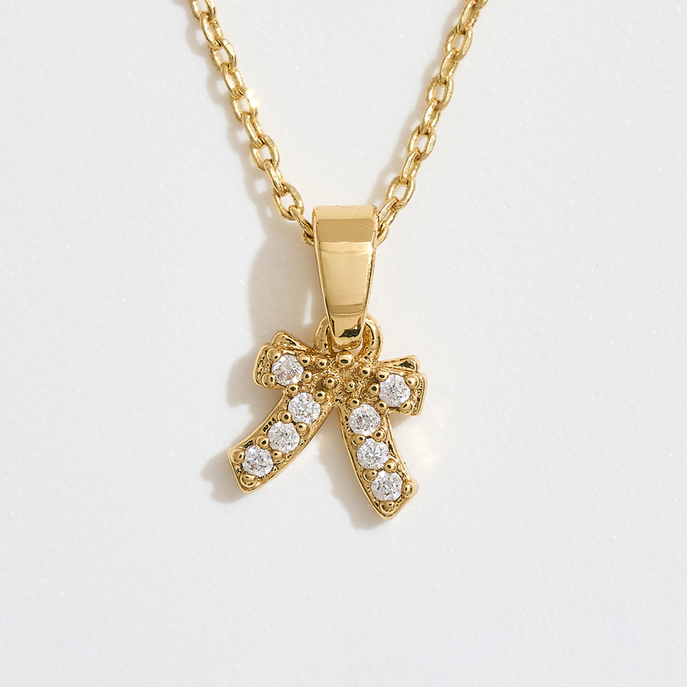 Details • Necklace Size : 16" + 2" L • Pendant Size : 0.3" X 0.6" • A delicate bow-shaped pendant adorned with sparkling CZ stones, this necklace adds a feminine and graceful charm to any outfit. Perfect for layering or wearing solo, it makes a versatile accessory for daily wear and a thoughtful gift for someone special. • CZ Cubic Zirconia • Gold Dipped • Made In Korea