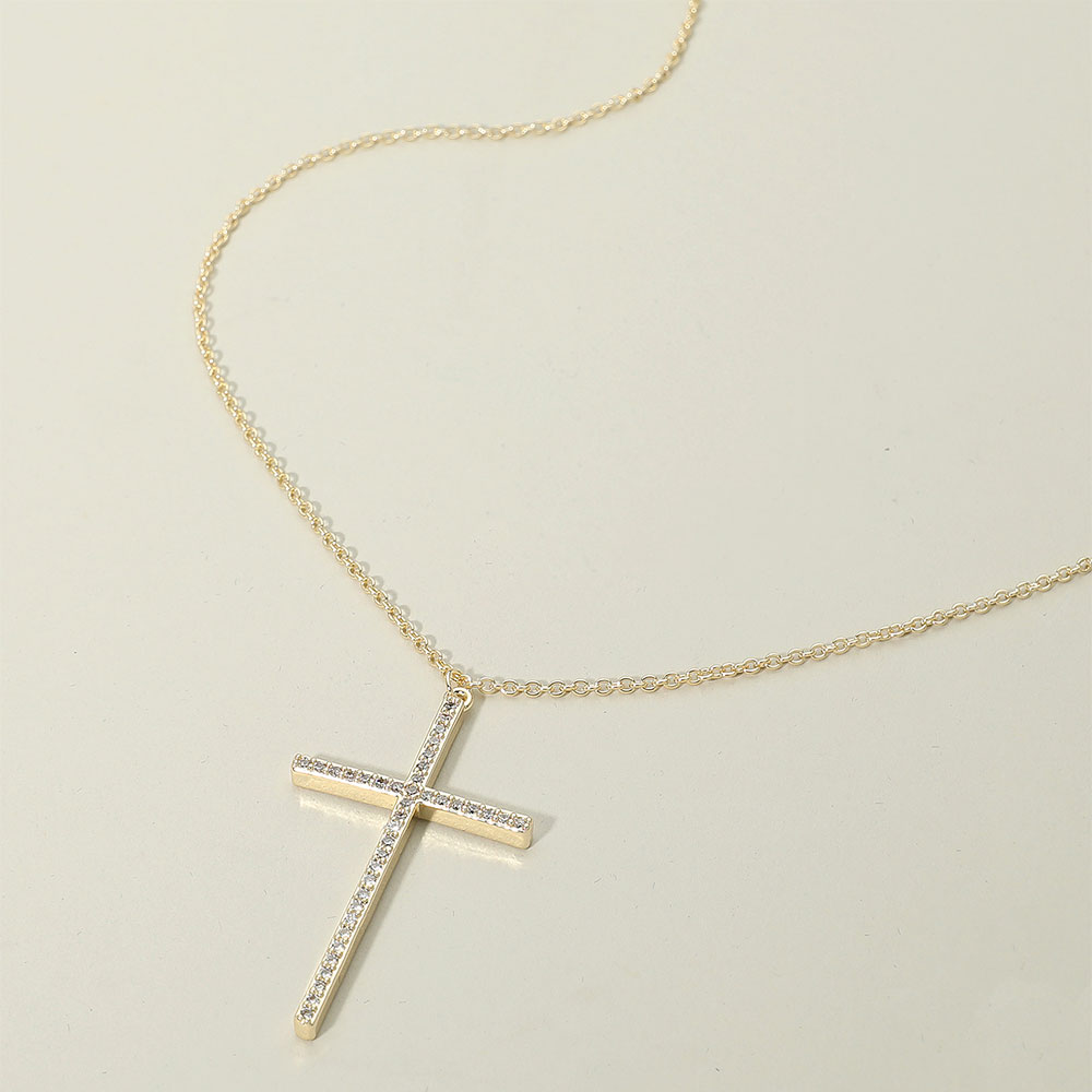 Details • Necklace Size : 16" + 2" L • Pendant Size : 1.2" X 2" • Elegant cross pendant necklace designed with shimmering accents on a delicate chain. A timeless piece that adds meaning and sophistication, perfect for layering or wearing alone for both casual and formal occasions. • CZ Cubic Zirconia • Gold Dipped