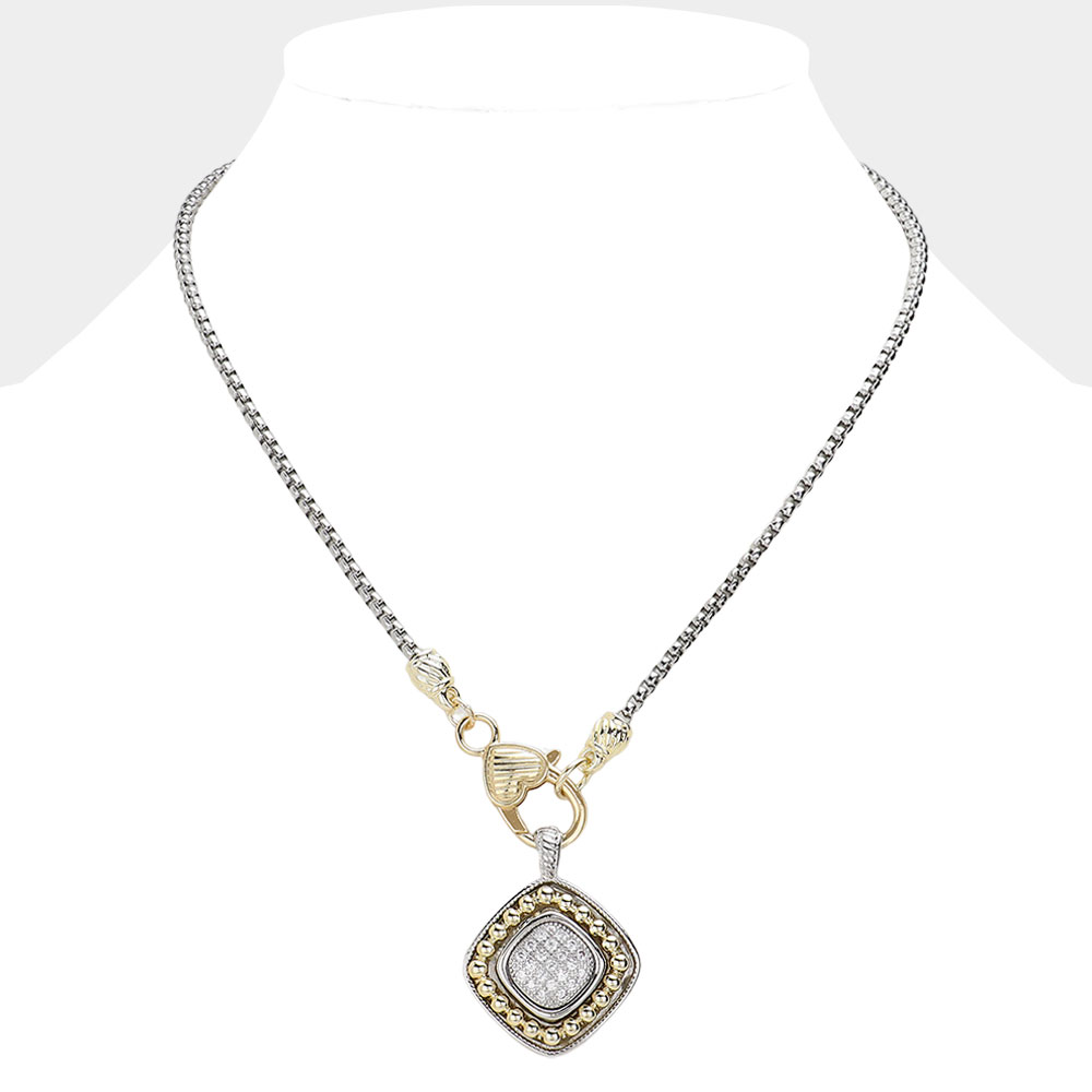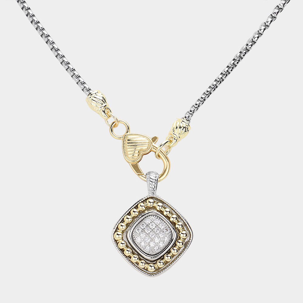 Details • Necklace Size : 17.5" L • Pendant Size : 1.2" X 1.5" • A chic square pendant highlighted by a luminous halo-style border and suspended from a polished chain for subtle sparkle. Crafted to elevate both casual and dressy ensembles with timeless elegance and refined charm. • Gold Dipped • CZ Cubic Zirconia