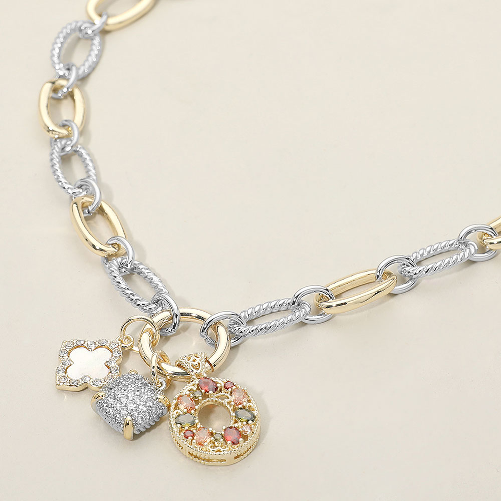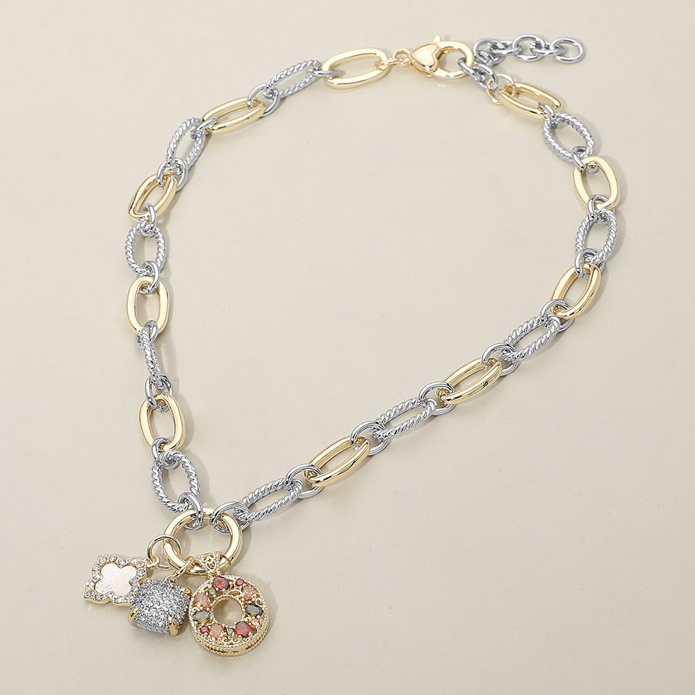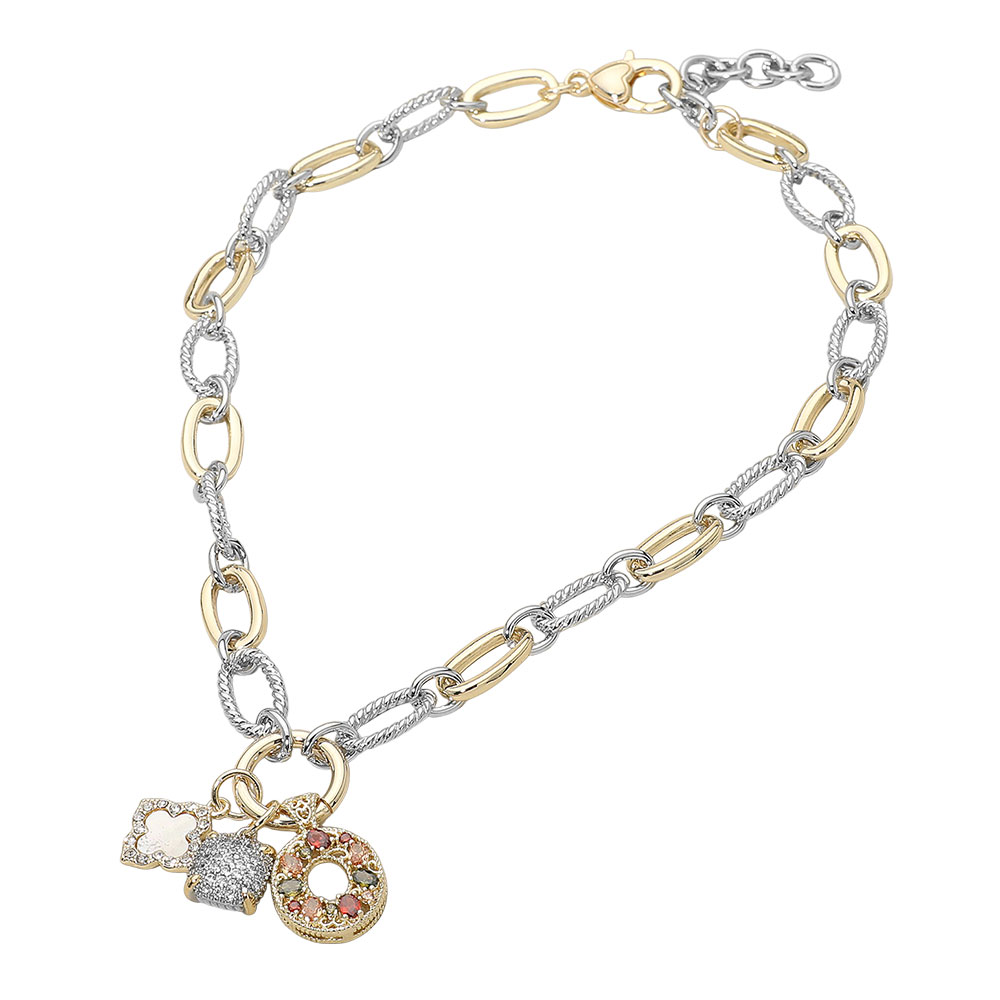 • Elevate your style with this two-tone link necklace featuring a mix of textured and smooth chains accented by decorative charms. Its versatile, eye-catching design adds a chic touch to casual or dressy looks, making it perfect for everyday wear or gifting.