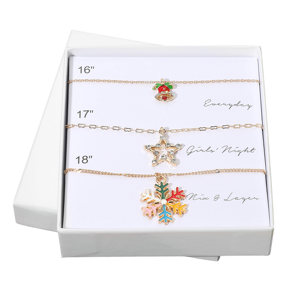 Details • Size 1 : 0.4" X 0.4", 16" + 2" L • Size 2 : 0.7" X 0.75", 17" + 2" L • Size 3 : 0.8" X 1", 18" + 2" L • Lobster Clasp Closure • Festive layered necklace set featuring three delicate chains with holiday charms including a bell, sparkling star, and colorful snowflake. Perfect for seasonal outfits, parties, or gifting.