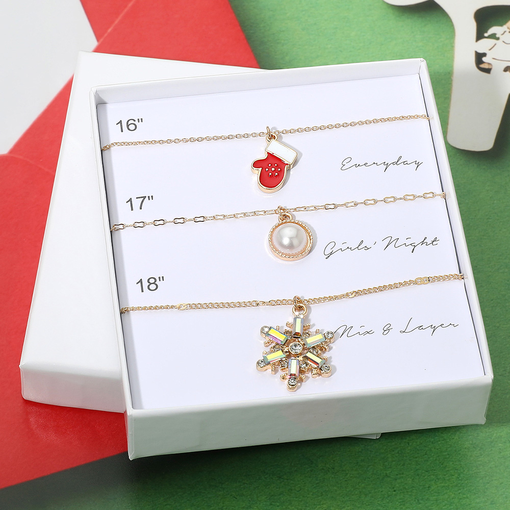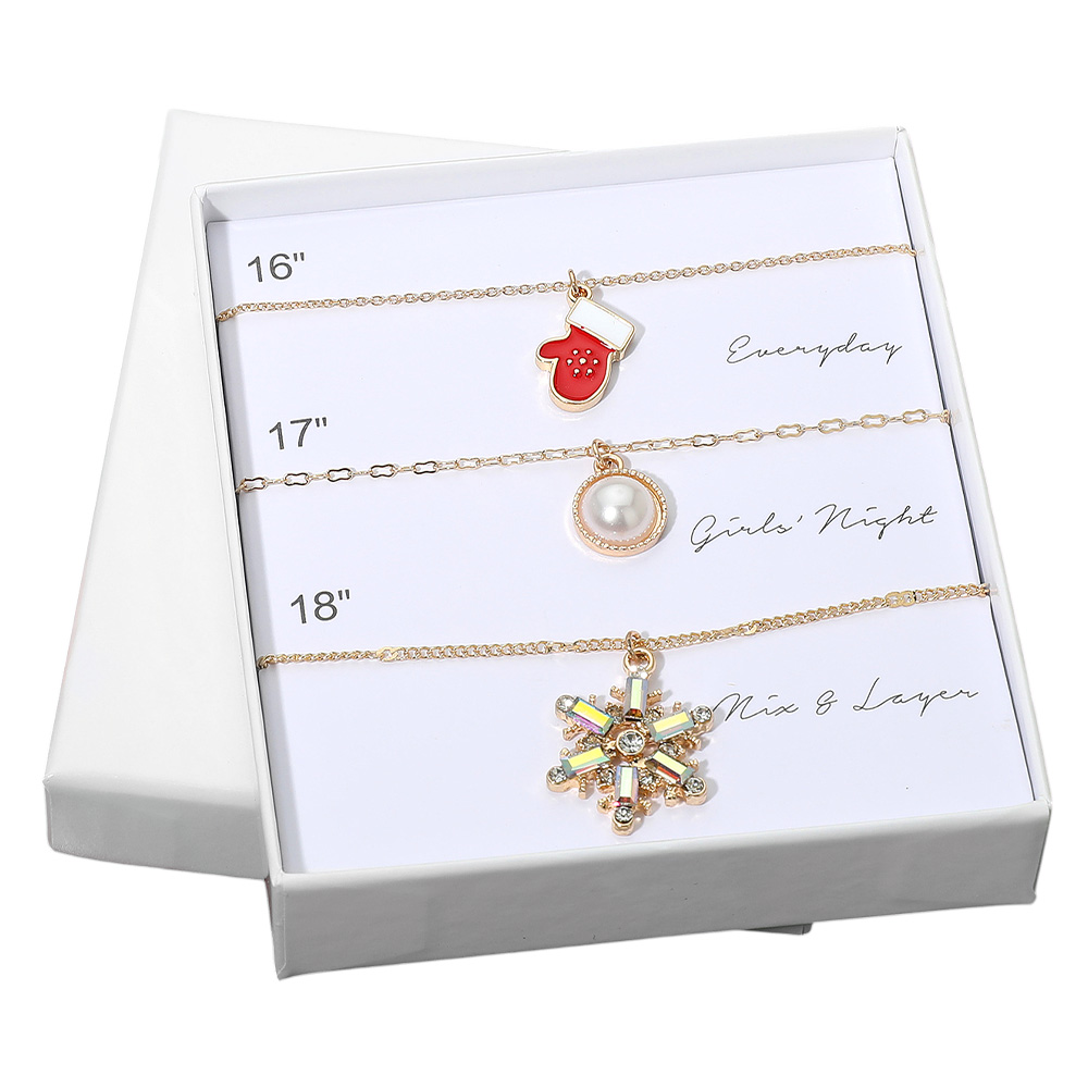 Details • Size 1 : 0.5" X 0.75", 16" + 2" L • Size 2 : 0.5" X 0.75", 17" + 2" L • Size 3 : 0.75" X 1", 18" + 2" L • Lobster Clasp Closure • Add seasonal sparkle with this three-piece layered necklace set featuring a playful charm, a delicate pearl accent, and a dazzling snowflake pendant. Perfect for layering or wearing separately, this versatile jewelry set makes an elegant accessory and a thoughtful gift for special occasions. • Lead and Nickel Compliant