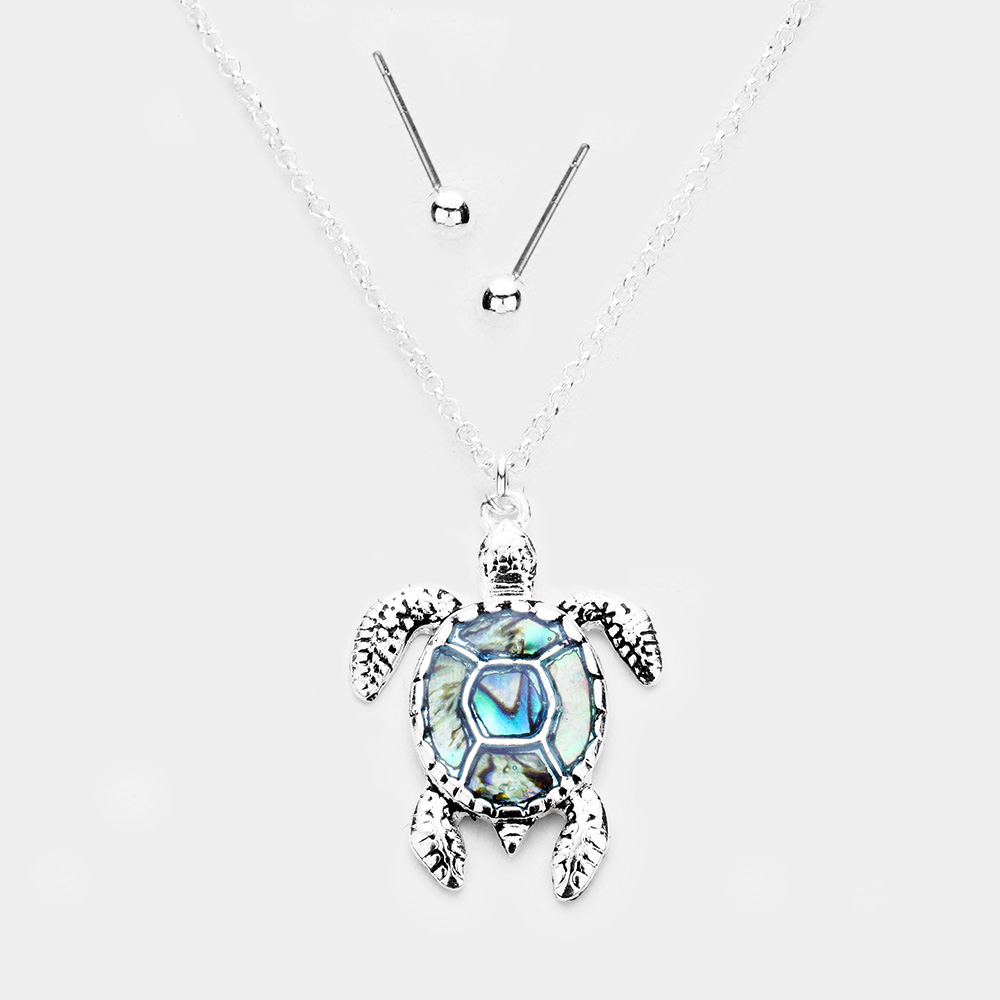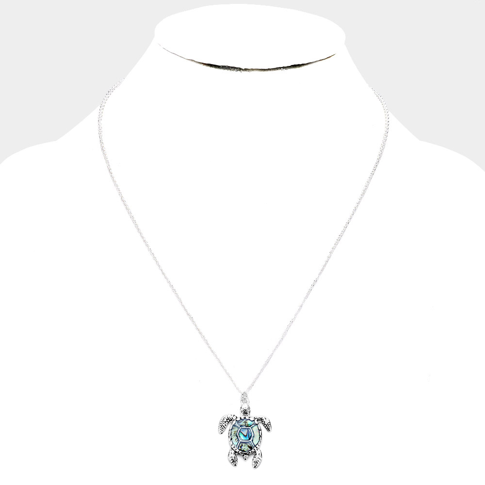 Abalone Stone Turtle Pendant Antique Silver Necklace