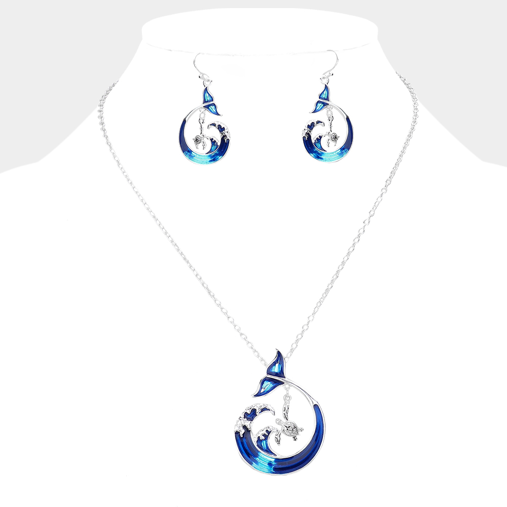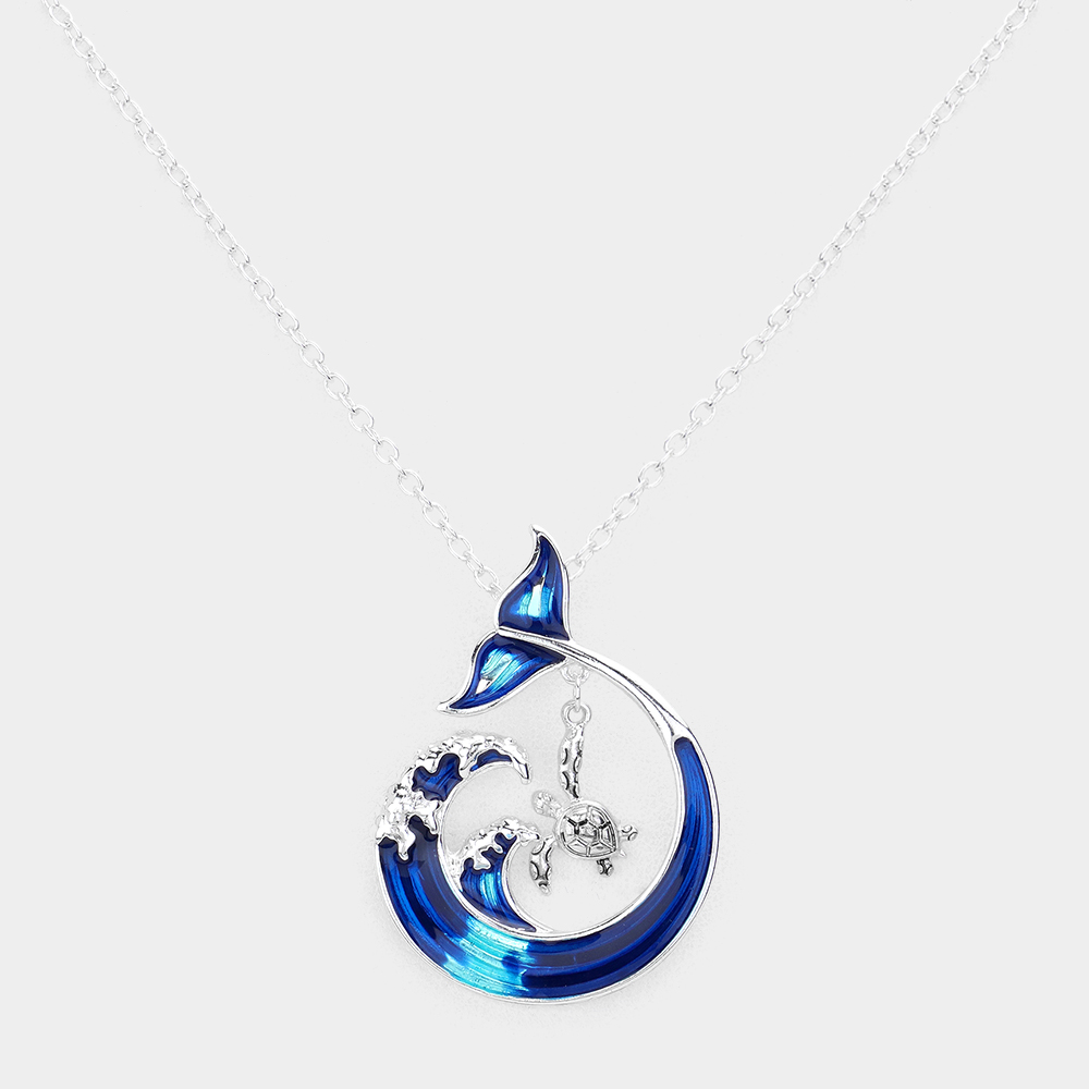 Antique Metal Enamel Wave Sea Turtle Pendant Necklace