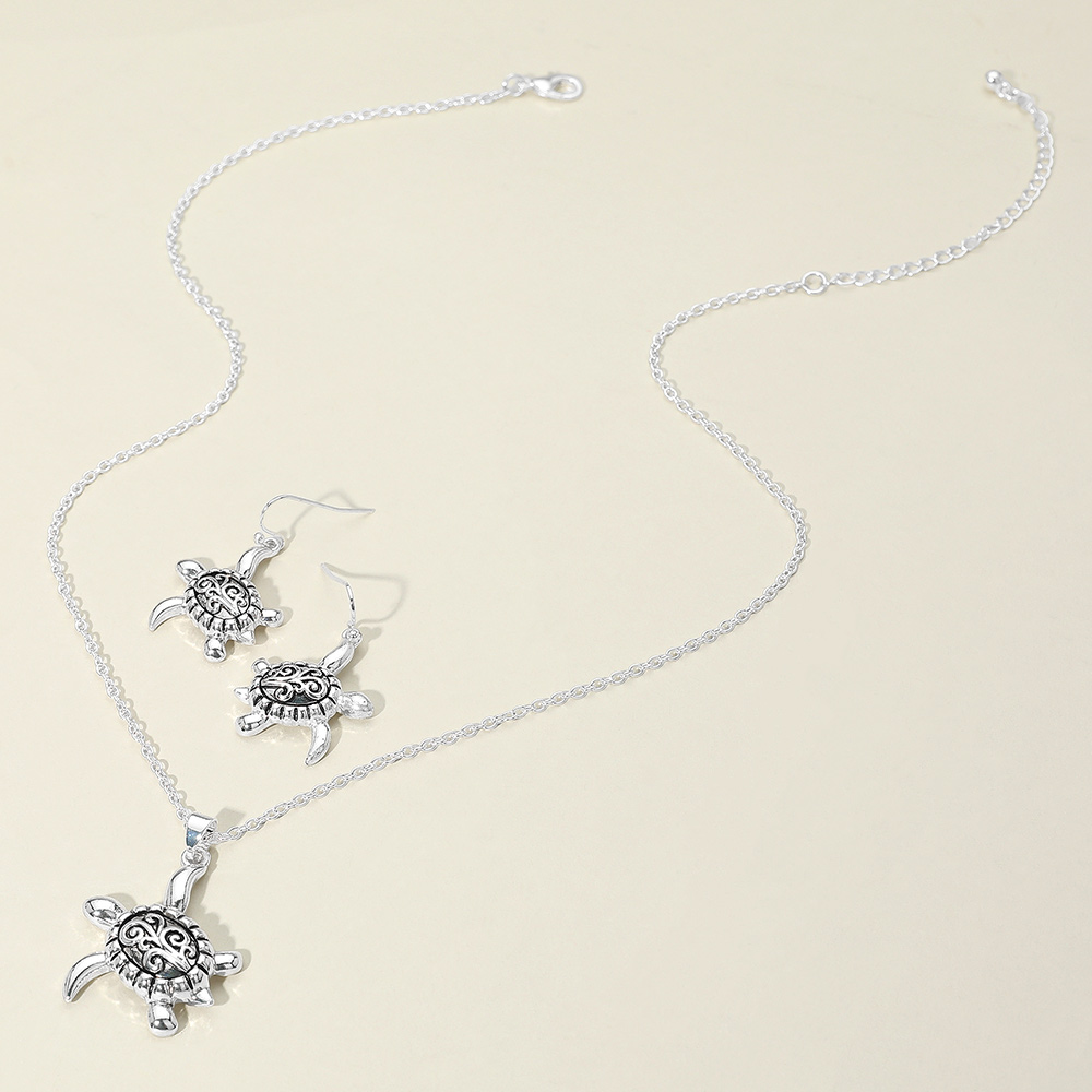 Details • Necklace Size : 18" + 3.25" L • Pendant Size : 1" X 1.5" • Earrings Size : 1.4" L • Adorable sea turtle jewelry set featuring a matching pendant necklace and drop earrings with intricate swirl detailing. Perfect for ocean lovers and those inspired by marine life, this charming accessory adds a whimsical touch to any look and makes a thoughtful gift for any occasion. • Lead and Nickel Compliant