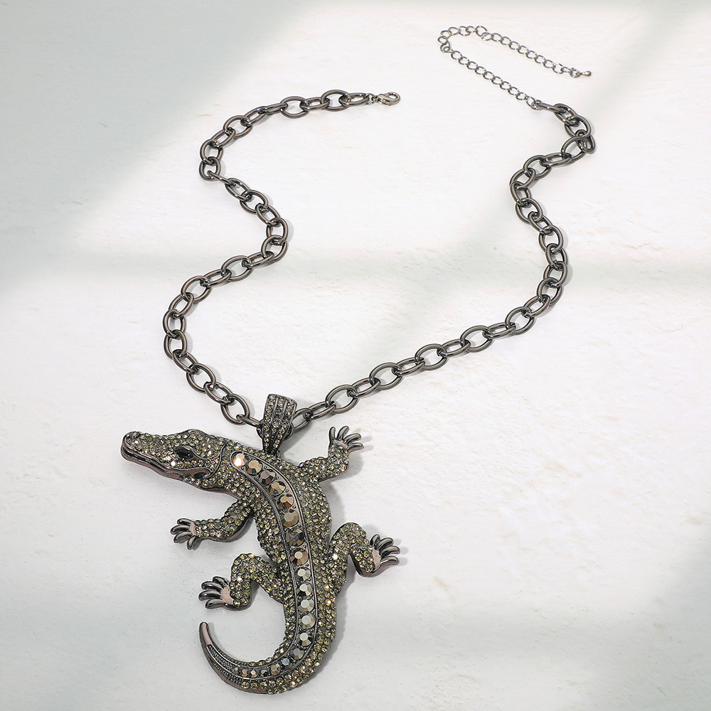 • Bold alligator pendant necklace with shimmering accents on a chunky chain. This statement jewelry piece combines edgy charm with artistic flair, perfect for fashion-forward looks or themed events, adding a fierce and captivating touch to any stylish outfit.
