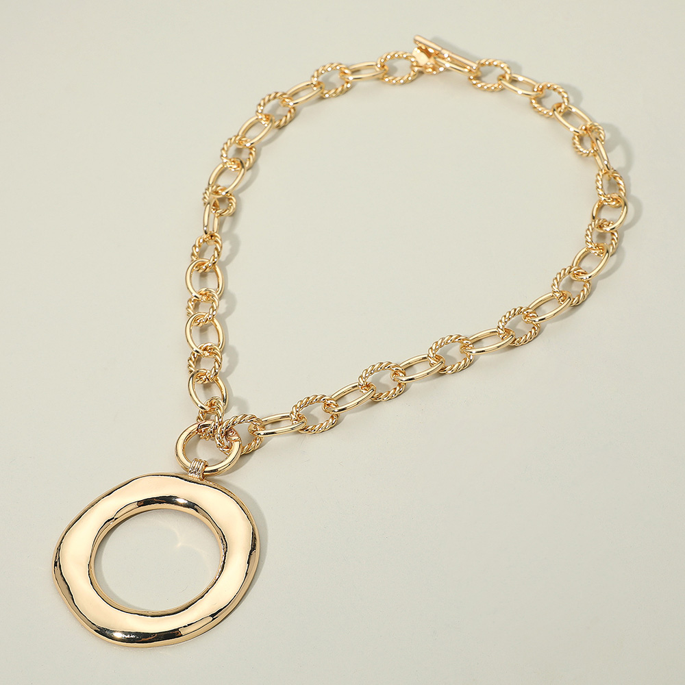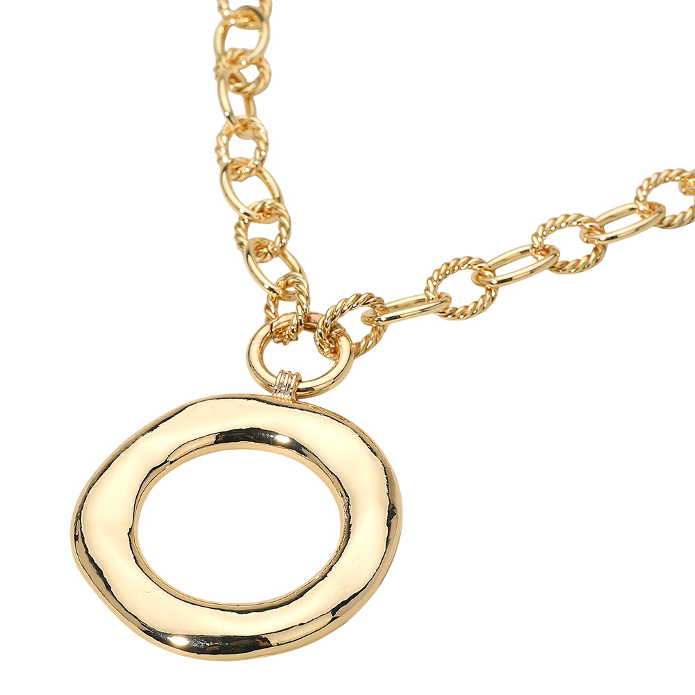Details • Necklace Size : 18.5" + 0.5" L • Pendant Size : 2" X 2.5" • Achieve effortless sophistication with this modern open circle pendant chain necklace. Featuring a bold circular charm on a textured link chain, this statement piece adds a touch of contemporary elegance—perfect for complementing casual, chic, or evening looks. • Lead and Nickel Compliant