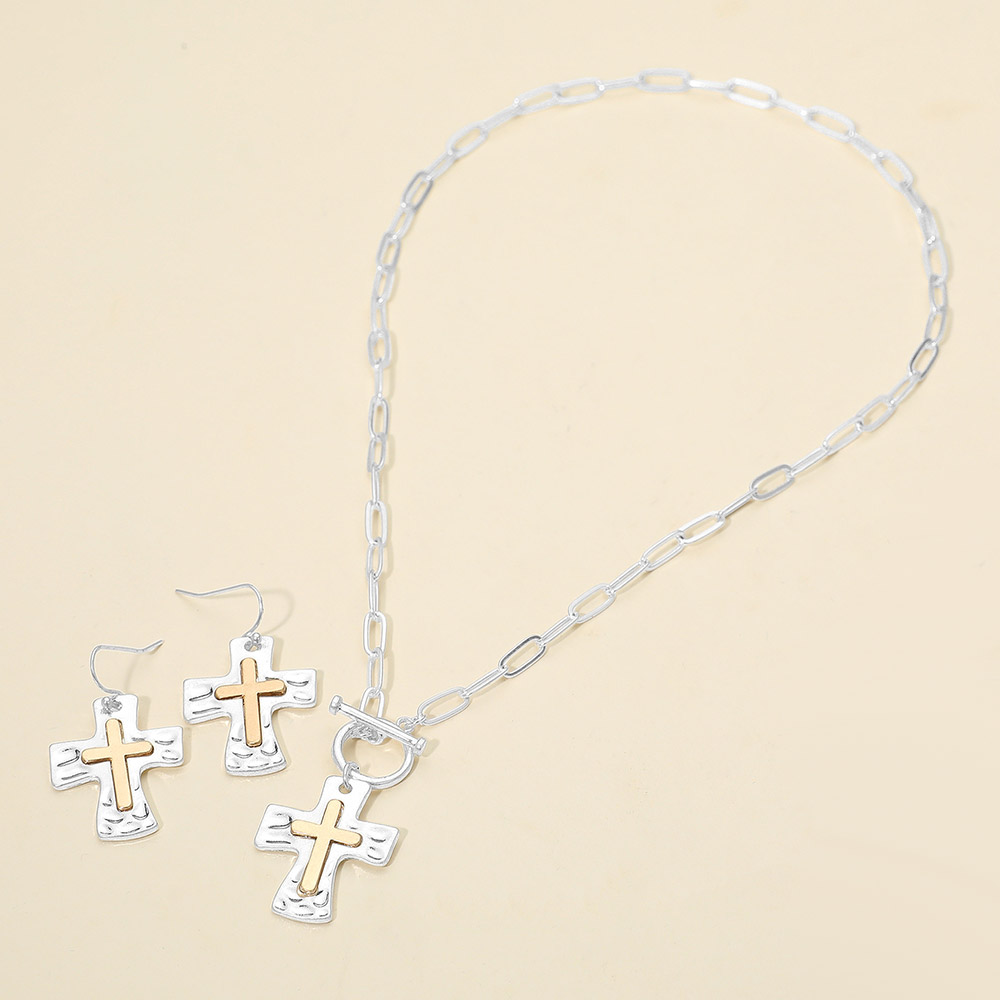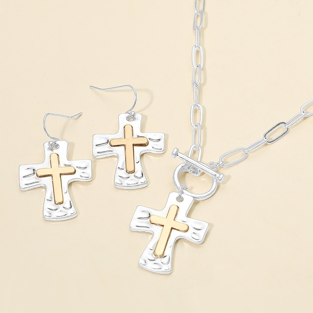 • This elegant jewelry set includes a link chain necklace with a cross pendant and matching drop earrings. The hammered detailing enhances its unique charm, making it a versatile accessory for casual wear or special occasions, adding a stylish and meaningful touch to your look.