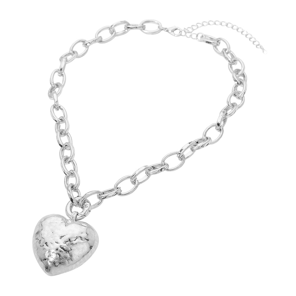 Chunky Hammered Metal Heart Pendant Statement Necklace