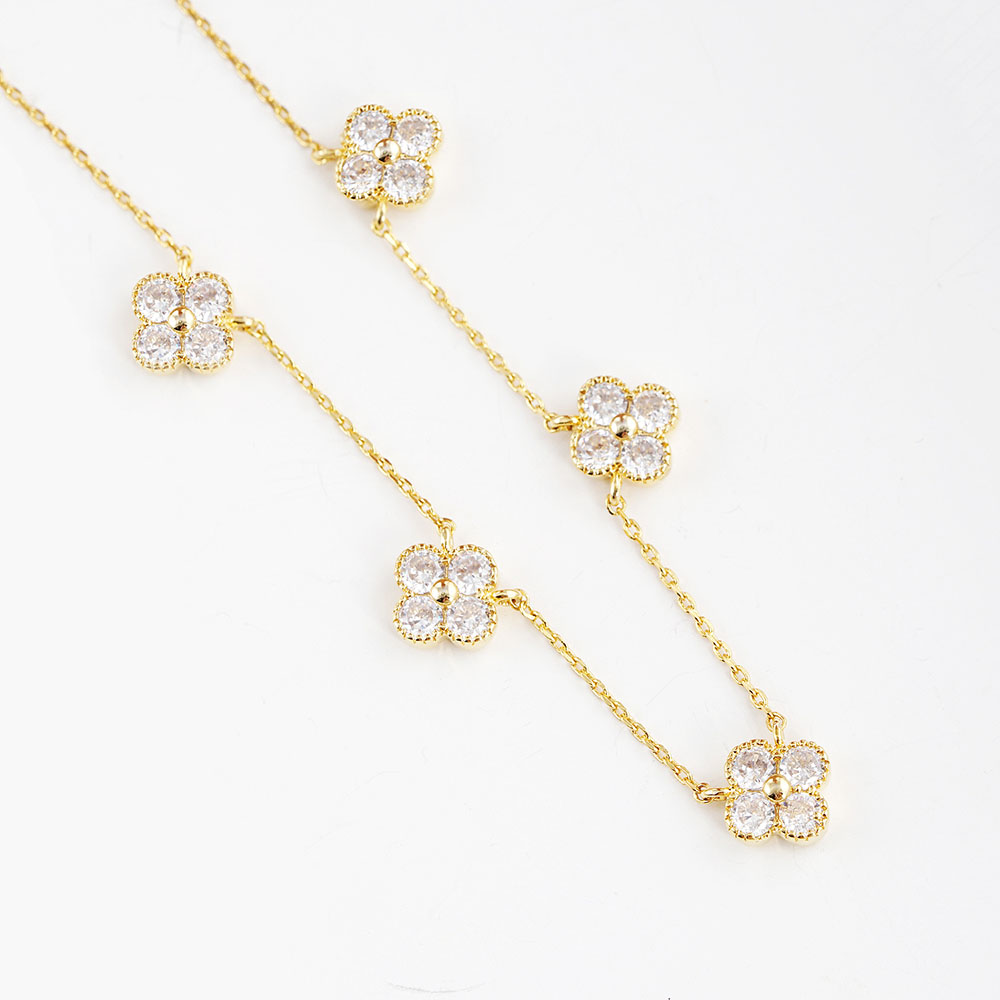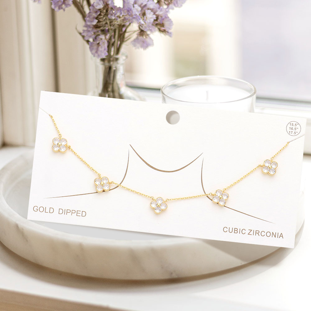 Gold Dipped CZ Quatrefoil Pendant Station Necklace
