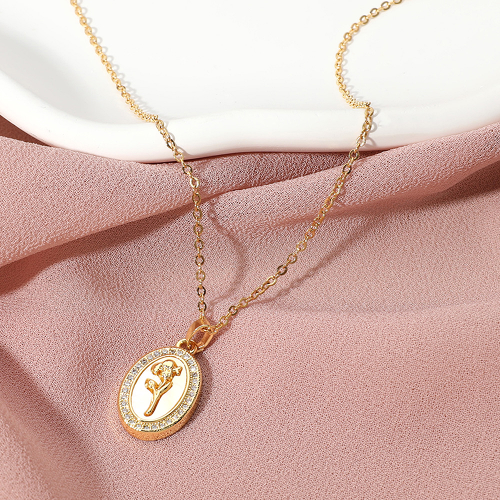 Gold Dipped CZ Stone Paved Tulip Flower Embossed Mother of Pearl Oval Pendant Necklace