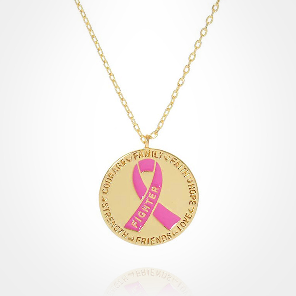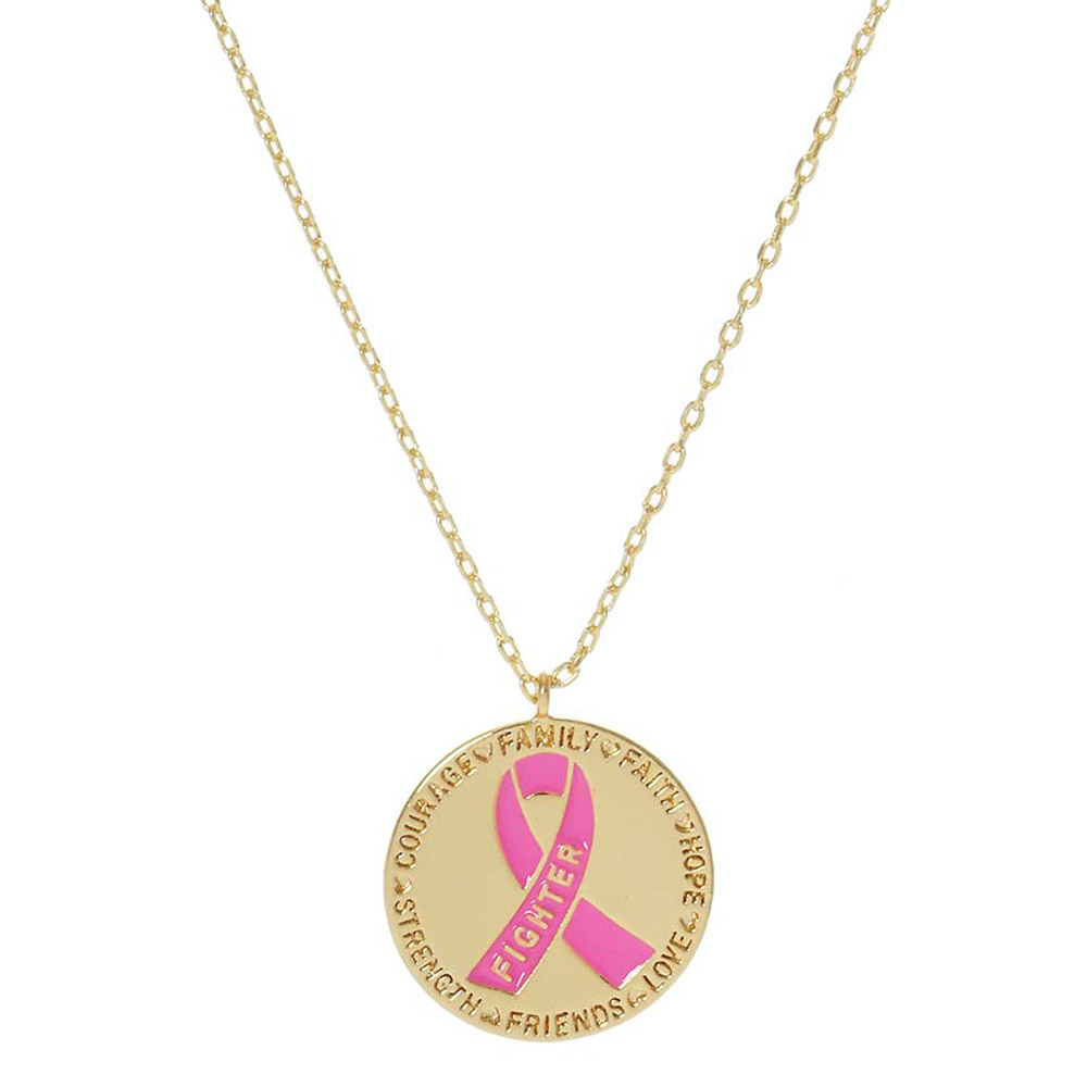 Details • Necklace Size : 15.5" + 2" L • Pendant Size : 0.6" X 0.6" • Celebrate resilience with this Pink Ribbon Fighter necklace, a powerful symbol of strength, courage, and awareness. Featuring a round pendant with inspiring words of love, faith, and hope, this meaningful piece honors warriors and survivors while spreading a message of support. • Lead and Nickel Compliant • Made In Korea • Gold Dipped