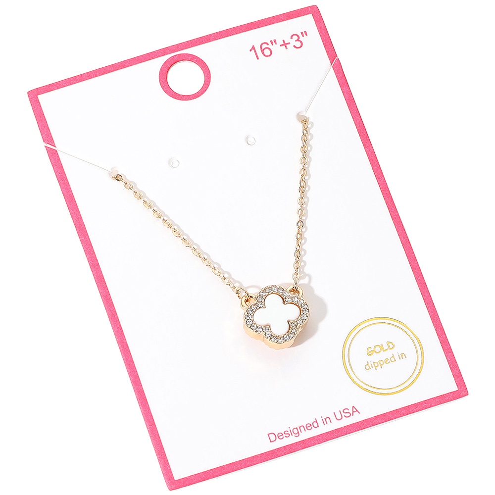 Gold Dipped Rhinestone Trim Quatrefoil Pendant Necklace