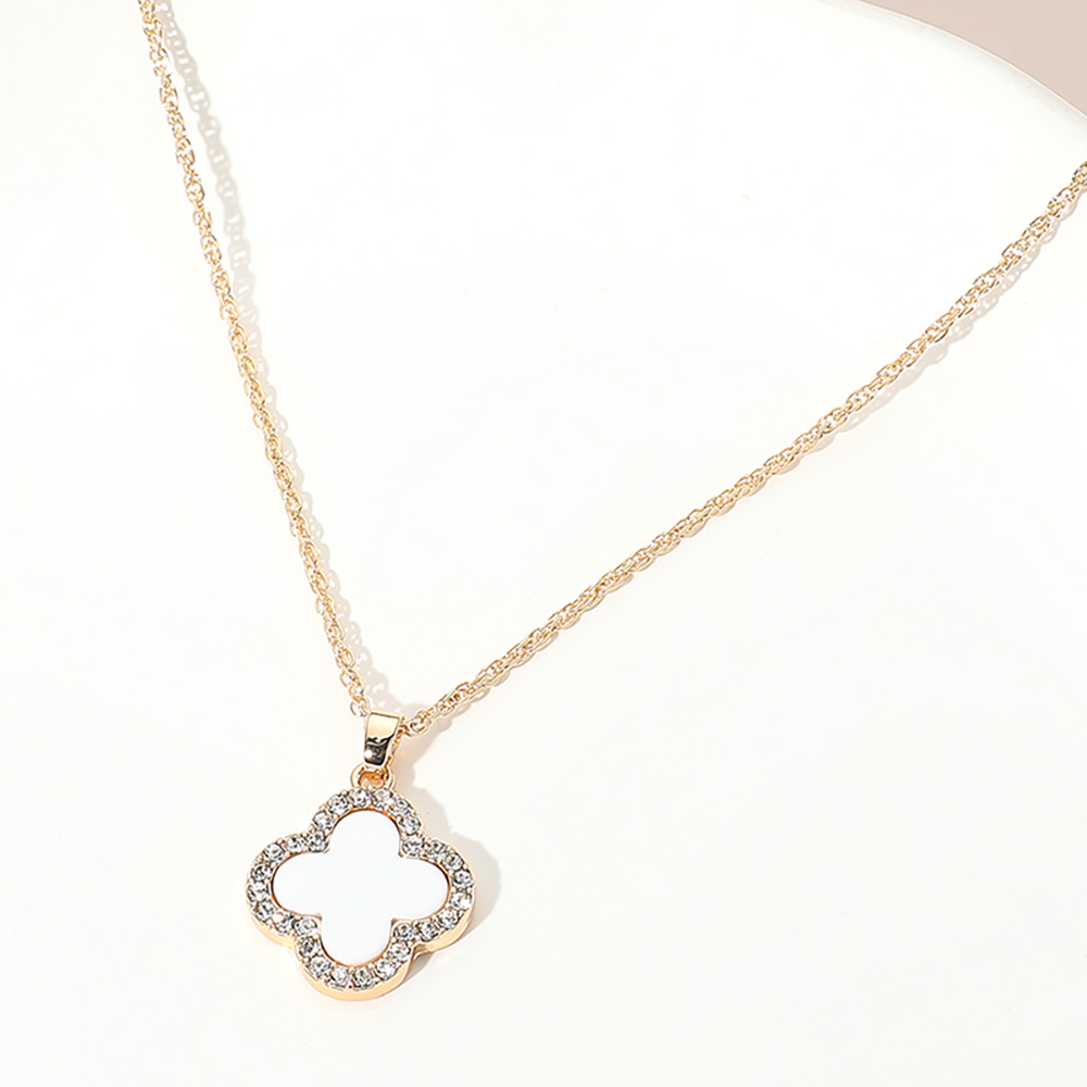 • This radiant quatrefoil outline pendant necklace features a hollow design surrounded by shimmering stones for a touch of elegance. Its delicate chain and timeless silhouette create a versatile accessory that complements both everyday wear and special occasions with effortless charm.