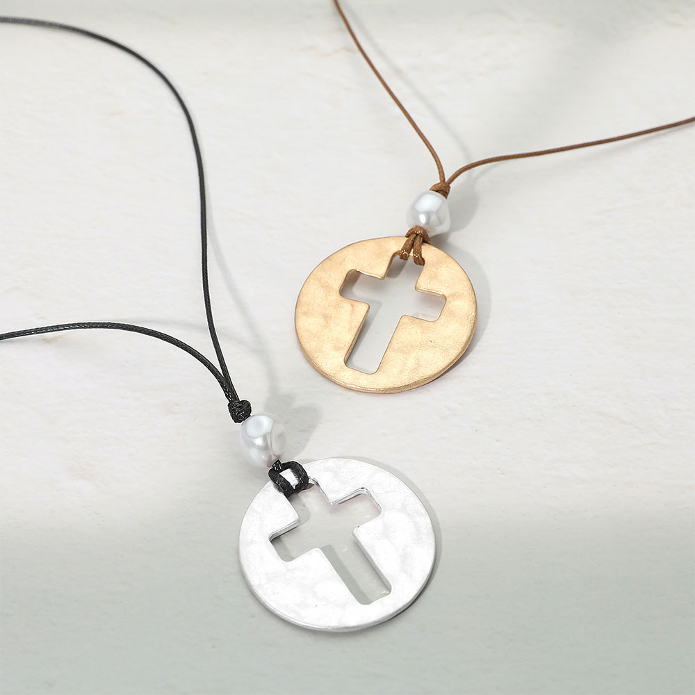 Details • Necklace Size : 17" + 3" L • Pendant Size : 1.6" X 2.2" • Embrace meaningful style with this round pendant necklace featuring a bold cross cut-out for a symbolic touch. Designed with a lightweight cord chain and adjustable closure, it blends faith and fashion for everyday wear. Perfect for layering or as a statement piece with casual or dressy outfits. • Lead and Nickel Compliant