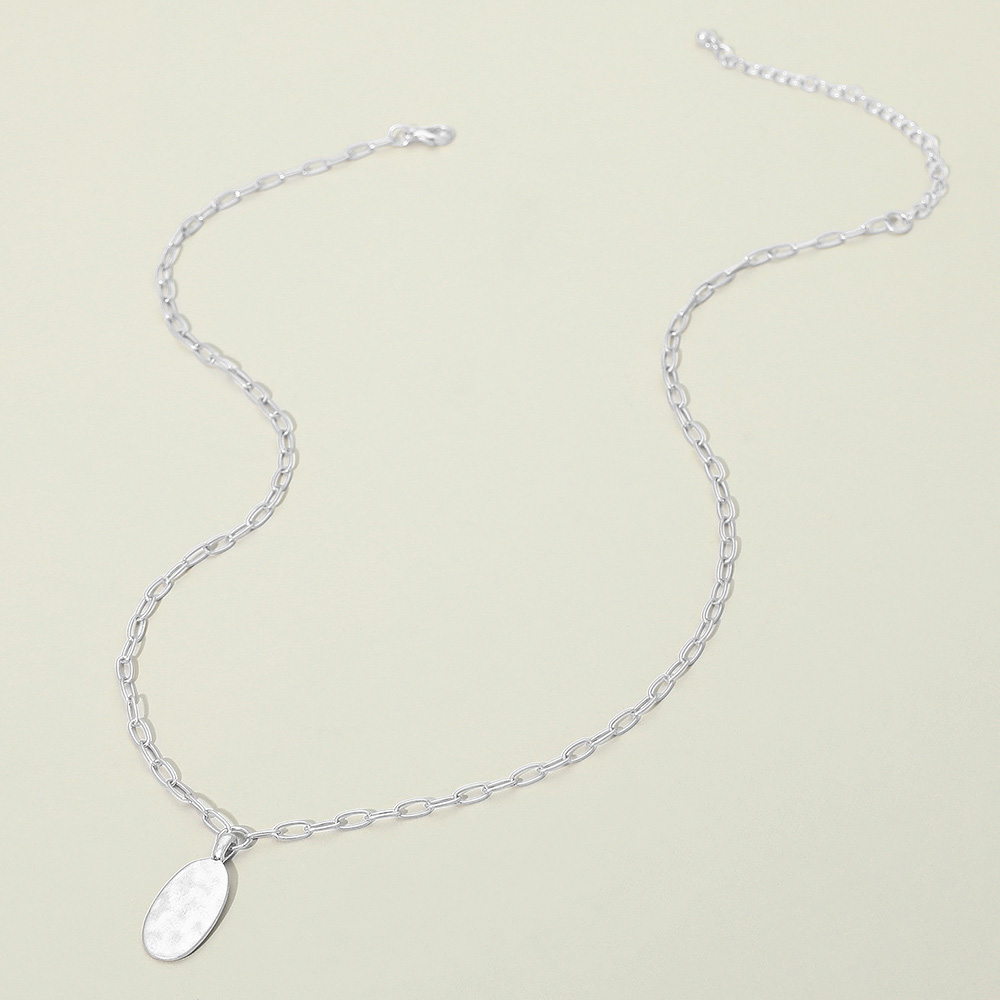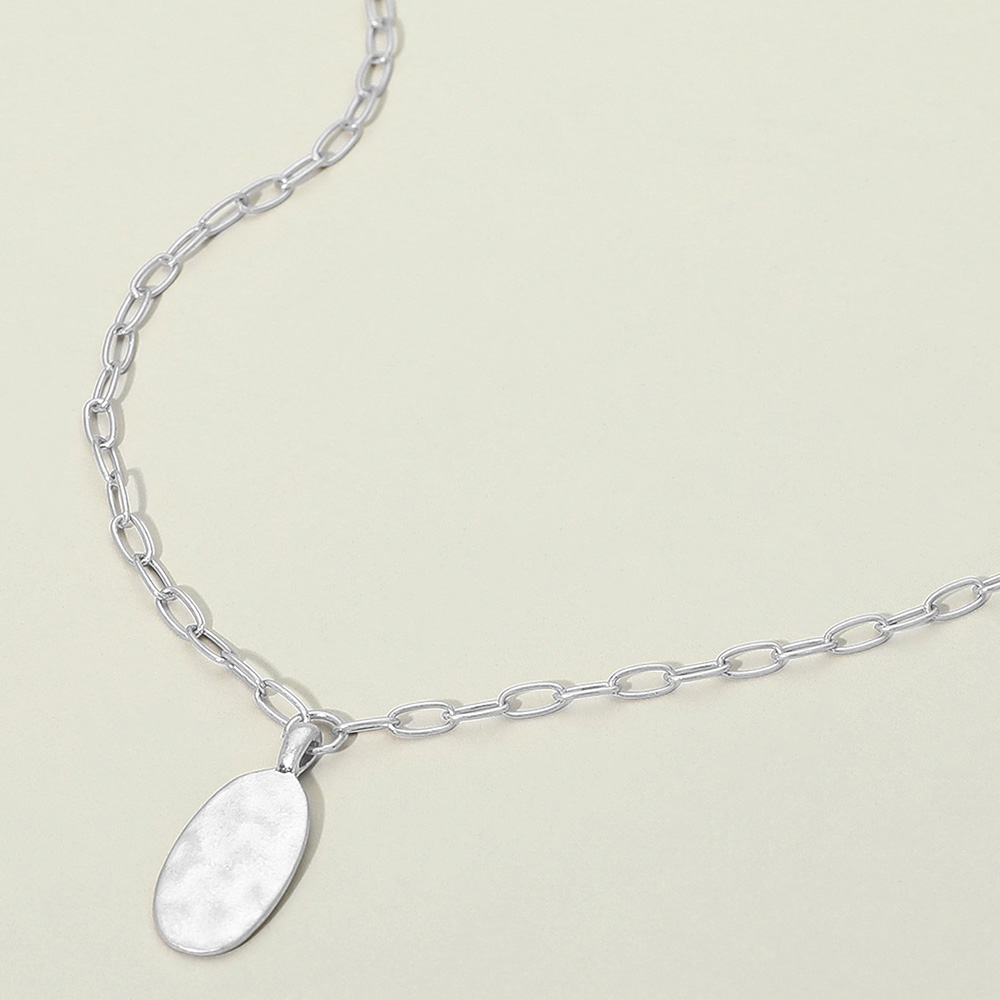 Details • Necklace Size : 18" + 3.25" L • Pendant Size : 0.5" X 1" • Minimalist oval pendant necklace with a delicate chain link design, perfect for layering or wearing solo. Its hammered finish adds a touch of modern elegance, making it a versatile accessory for everyday wear or special occasions. A timeless piece that complements any outfit. • Lead and Nickel Compliant