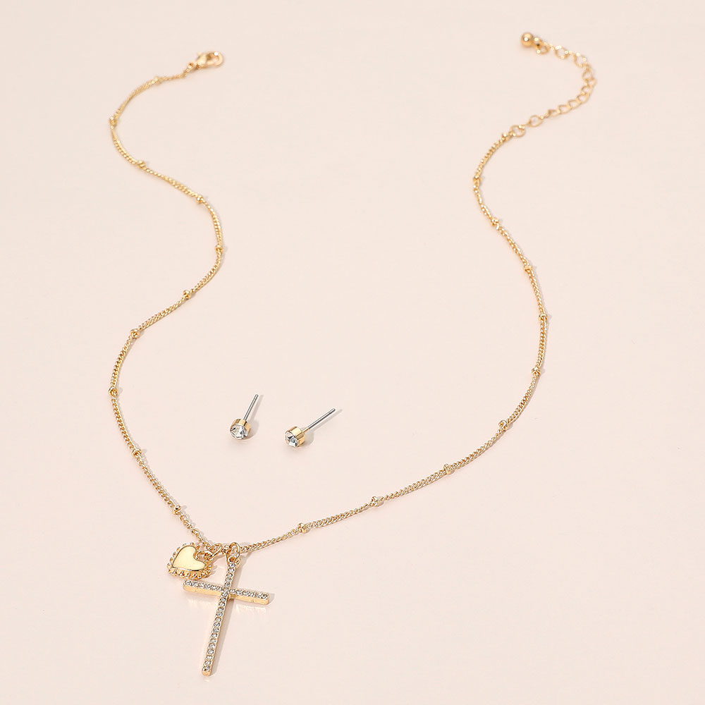 Details • Necklace Size : 16" + 2" L • Pendant Size : 0.75" X 1.25" • Earrings Size : 0.2" L • Add meaningful elegance to your look with this delicate pendant necklace featuring a heart and cross charm, paired with classic stud earrings. Perfect for everyday wear or special moments, this set brings a subtle shine and thoughtful style to any outfit. • Lead and Nickel Compliant