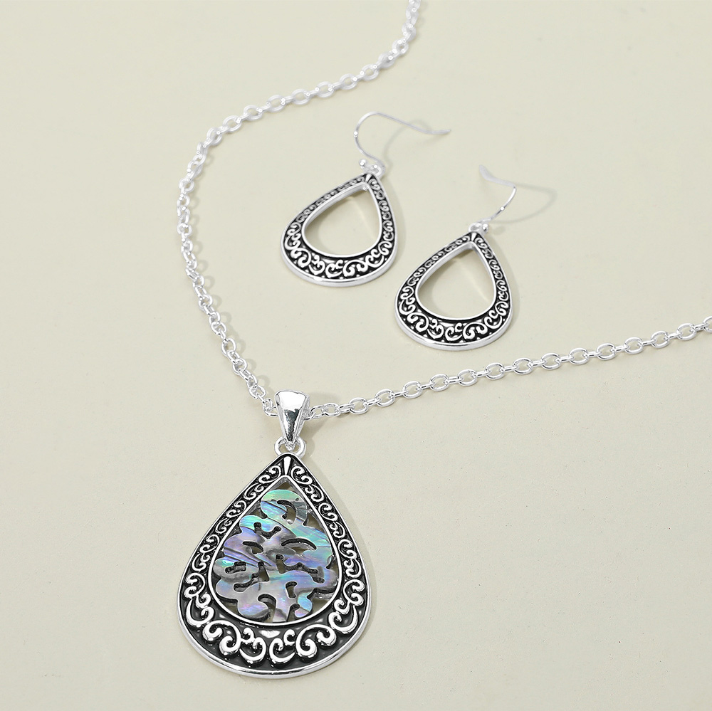 • Complete your look with this stunning abalone teardrop pendant and matching earring set. The intricate scrollwork detailing enhances the natural shimmer of the design, creating a sophisticated and eye-catching ensemble perfect for any occasion.