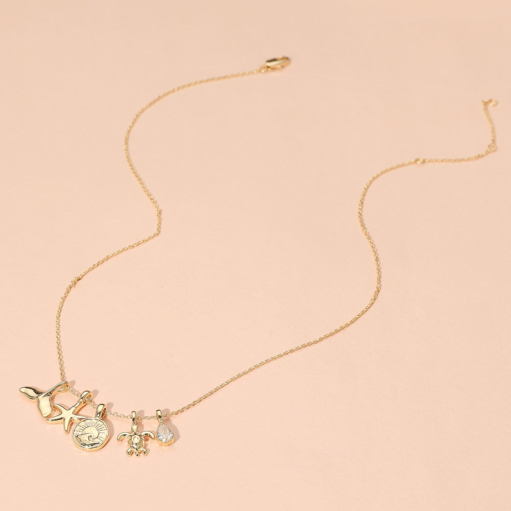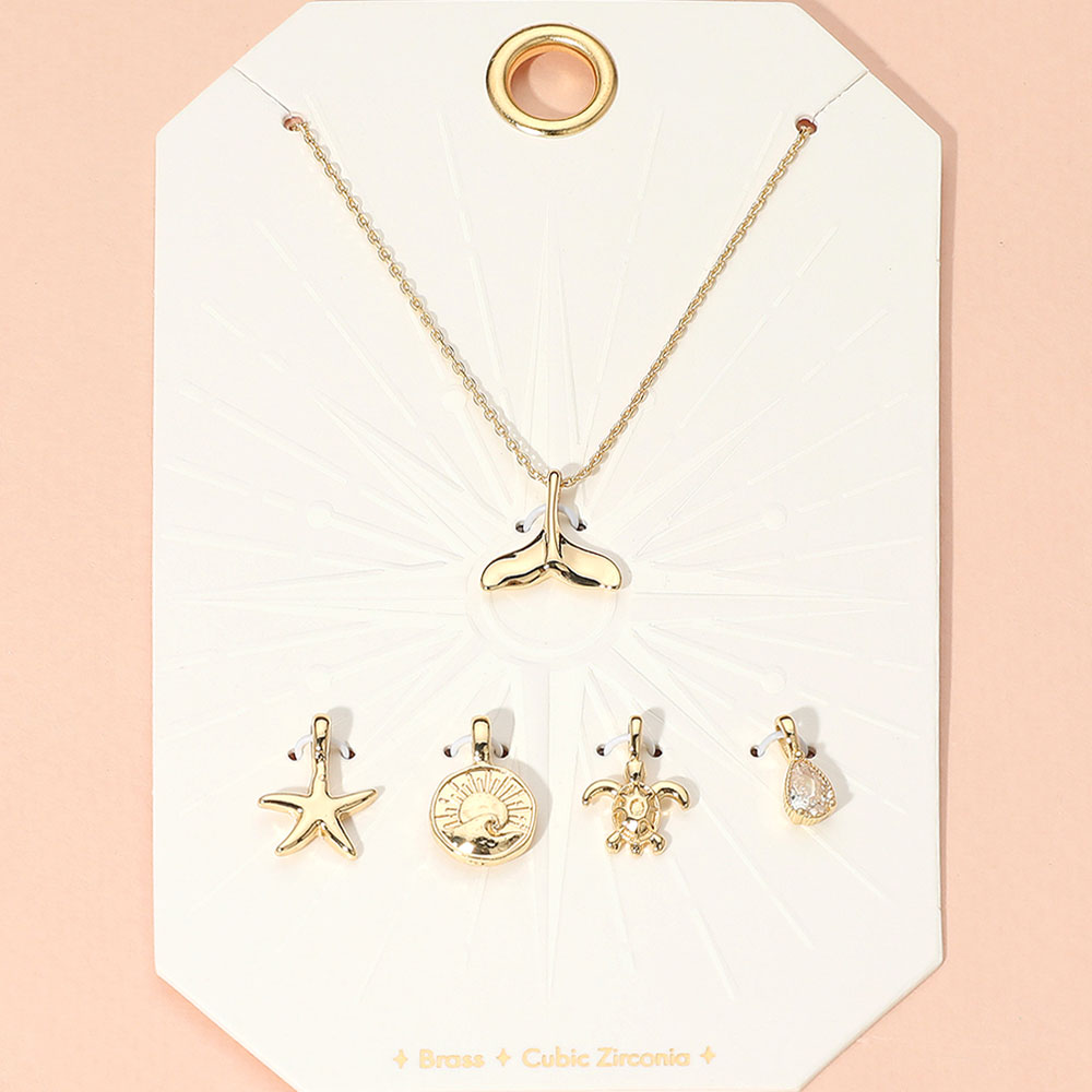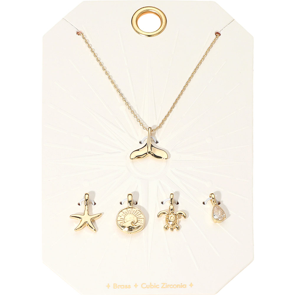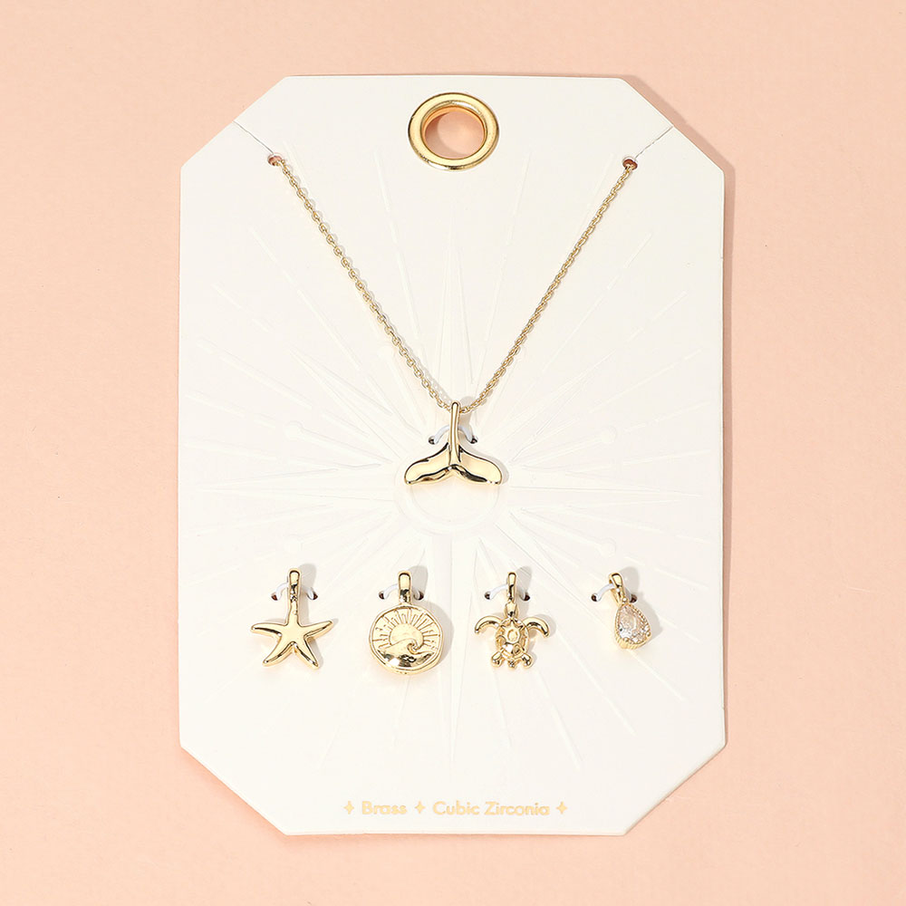 Details • Necklace Size : 15" + 2.25" L • Pendant Size : 0.5" - 0.6" L (5PCS) • Elegant necklace featuring a whale tail pendant and four interchangeable ocean-themed charms including a starfish, turtle, wave medallion, and teardrop gem. Perfect for personalizing your beach-inspired look. • Brass • CZ Cubic Zirconia