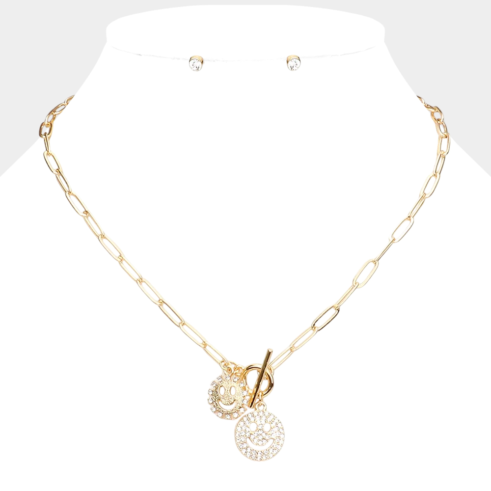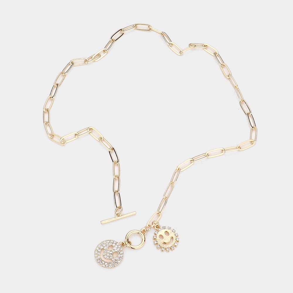 Rhinestone Embellished Double Smile Pendant Toggle Necklace