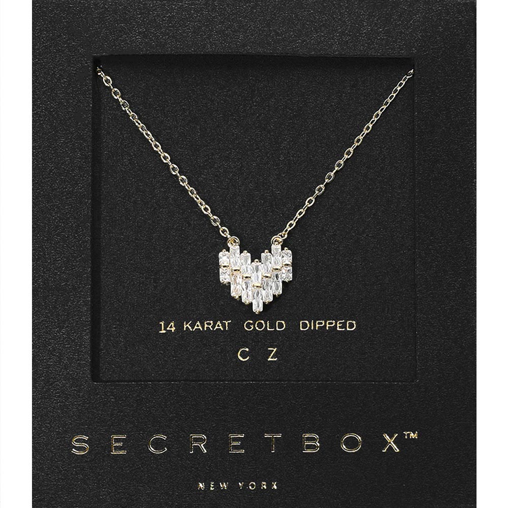Details • Necklace Size : 16" + 2.5" L • Pendant Size : 0.4" X 0.4" • Add a touch of luxury to your style with this 14K gold dipped baguette CZ heart necklace. The sparkling geometric stones form a radiant heart design, creating a sophisticated statement piece that shines beautifully for both everyday elegance and special occasions. • Gold Dipped • CZ Cubic Zirconia