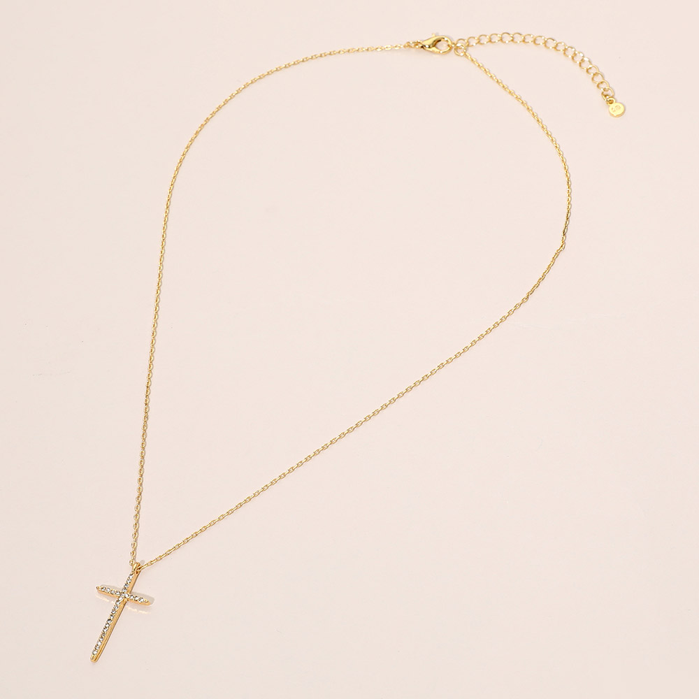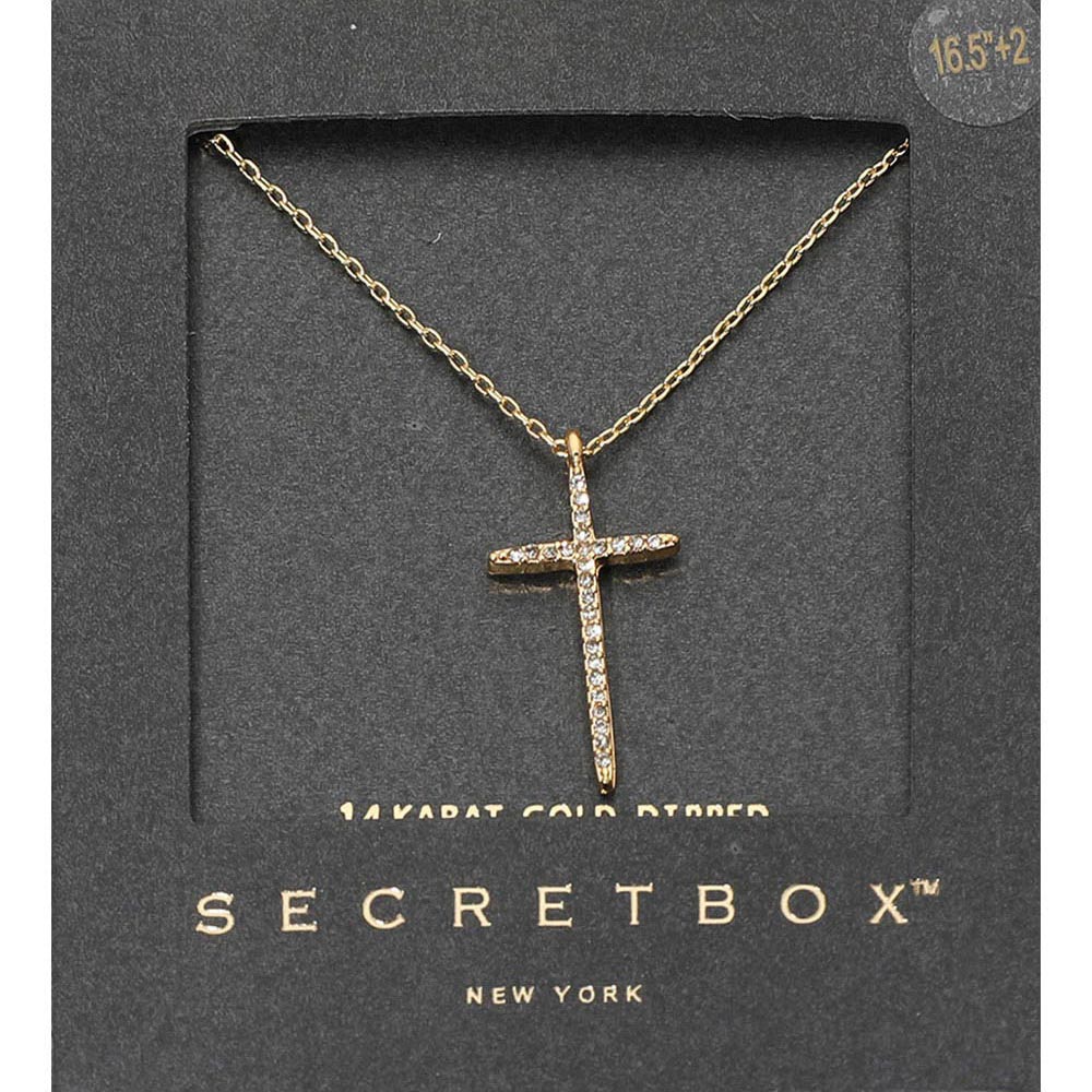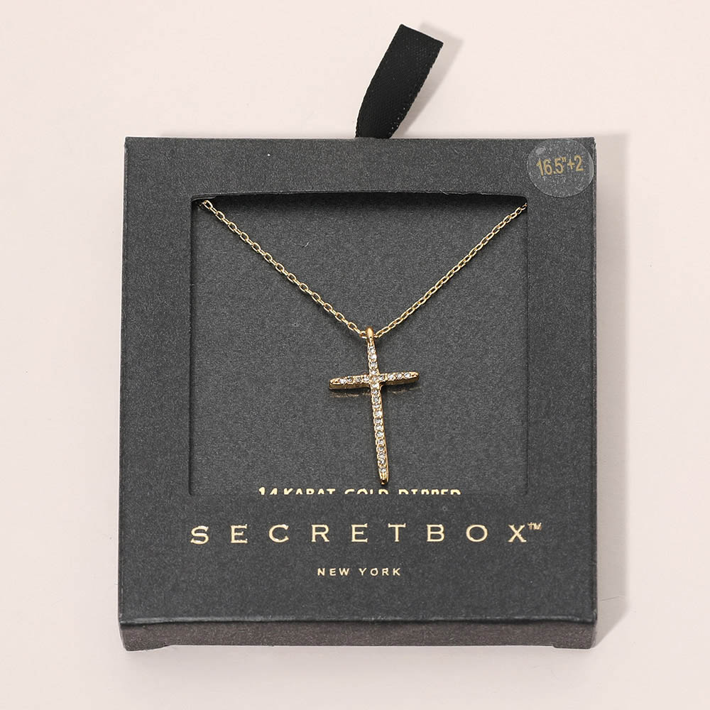 SECRET BOX_14K Gold Dipped Stone Paved Cross Pendant Necklace