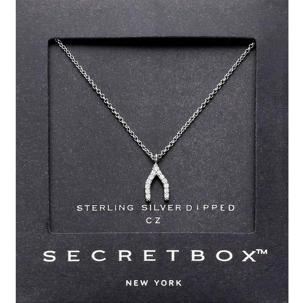 Details • Necklace Size : 16.5" + 2" L • Pendant Size : 0.25" X 0.5" • Make every day a lucky one with this sterling silver dipped CZ wishbone necklace. Its sparkling cubic zirconia accents and graceful minimalist shape bring timeless charm, symbolizing hope and good fortune in a refined design perfect for layering or gifting. • CZ Cubic Zirconia • Sterling Silver Dipped