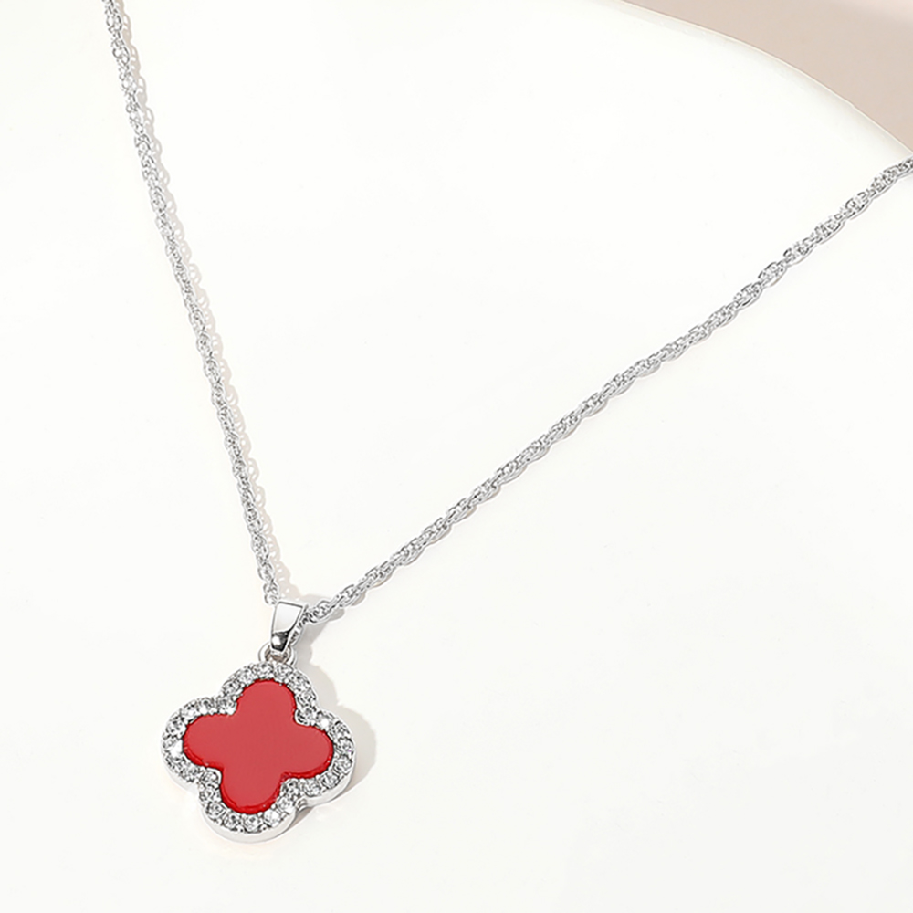 • This radiant quatrefoil outline pendant necklace features a hollow design surrounded by shimmering stones for a touch of elegance. Its delicate chain and timeless silhouette create a versatile accessory that complements both everyday wear and special occasions with effortless charm.