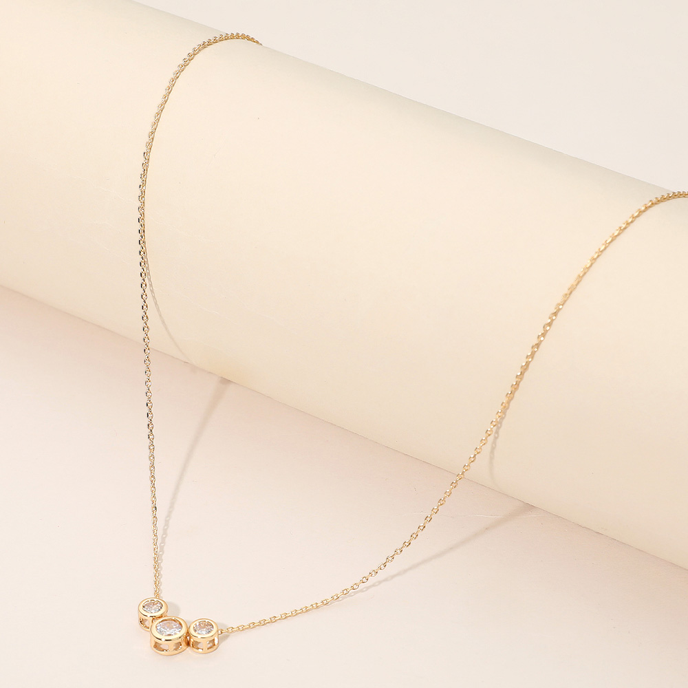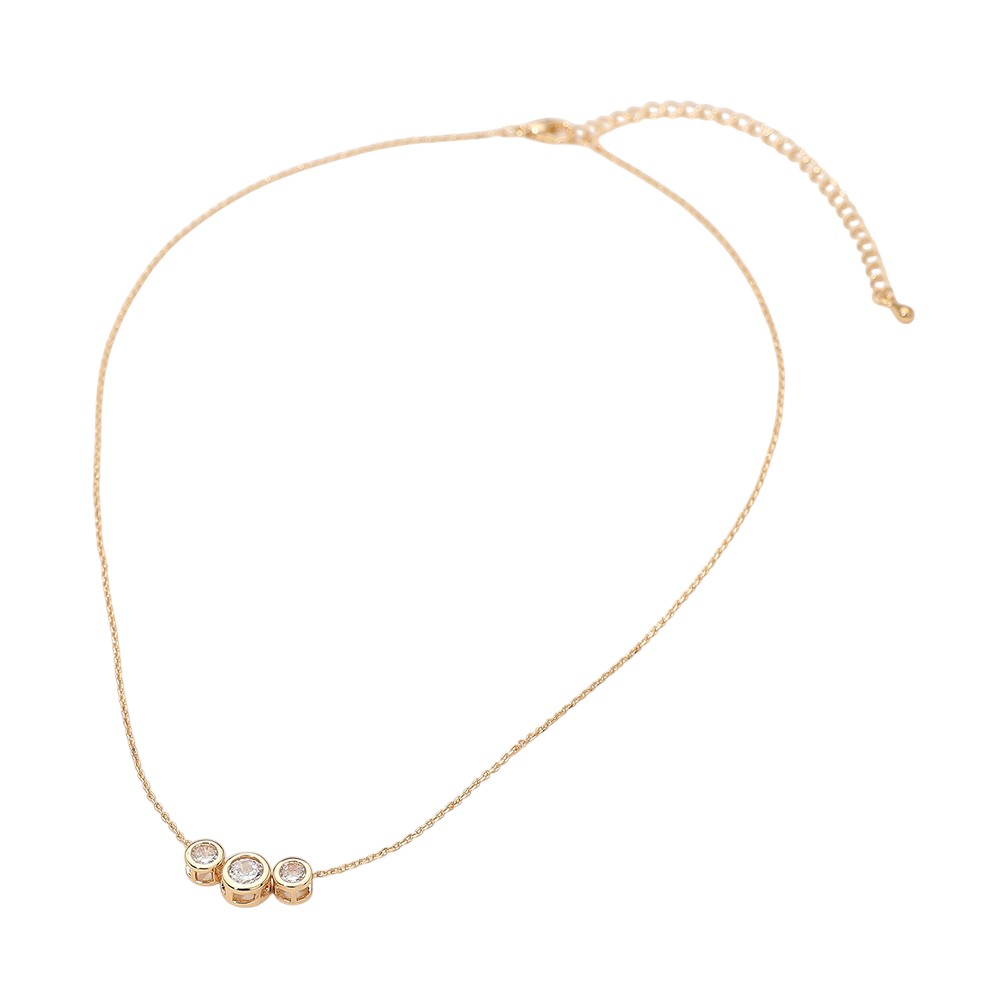 Details • Necklace Size : 16" + 3.5" L • Pendant Size : 0.5" L • Chic minimalist necklace featuring three bezel-set round charms for a touch of refined sparkle. Perfect for everyday wear or layering with other pieces, this dainty chain adds effortless elegance to any outfit, blending simplicity and sophistication in a timeless modern design. • Brass • Lead and Nickel Compliant