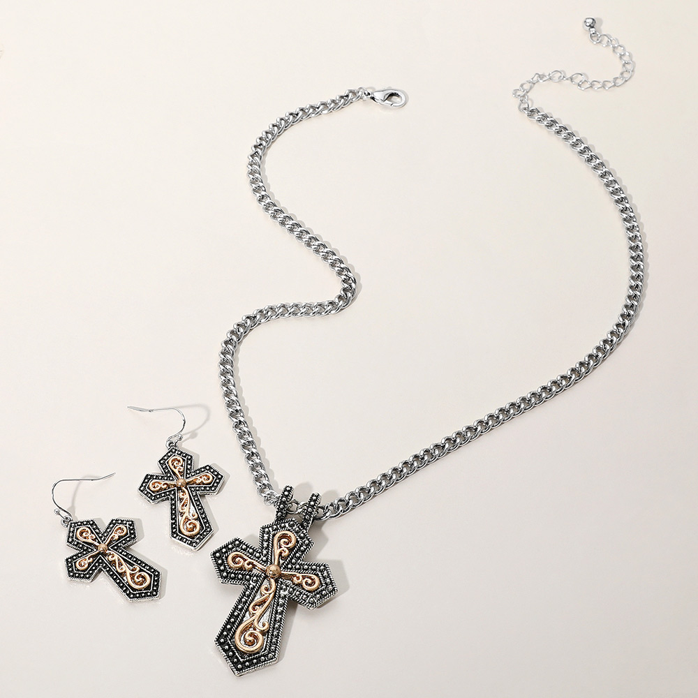 • Striking jewelry set featuring a cross pendant necklace with coordinating earrings. Intricate detailing and bold design make it a standout accessory for faith-inspired or statement styling.