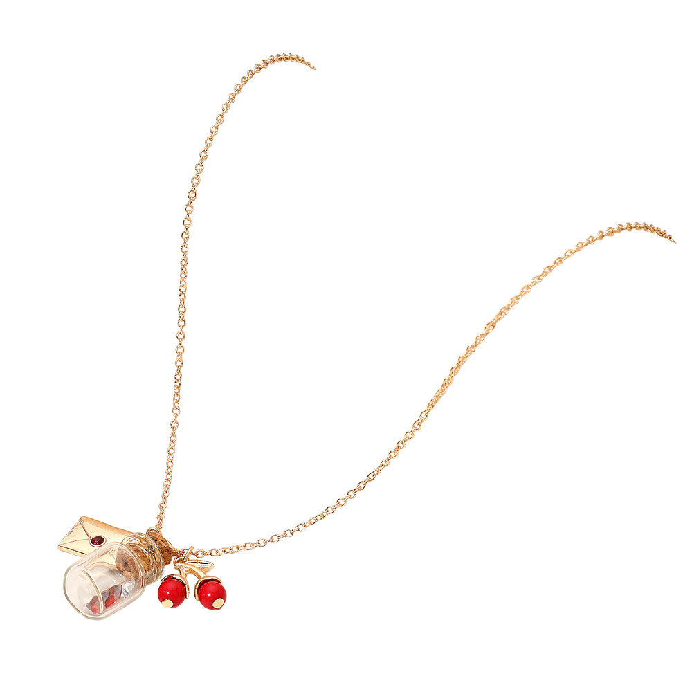 Details • Necklace Size : 17" + 3" L • Pendant Size : 0.5" X 0.9" • Whimsical charm necklace featuring a mini glass bottle, cherry pendant, and tiny envelope charm for a playful yet elegant look. Perfect for adding a cute and creative touch to everyday outfits, blending charm and sophistication in one delightful and eye-catching accessory. • Lead and Nickel Compliant