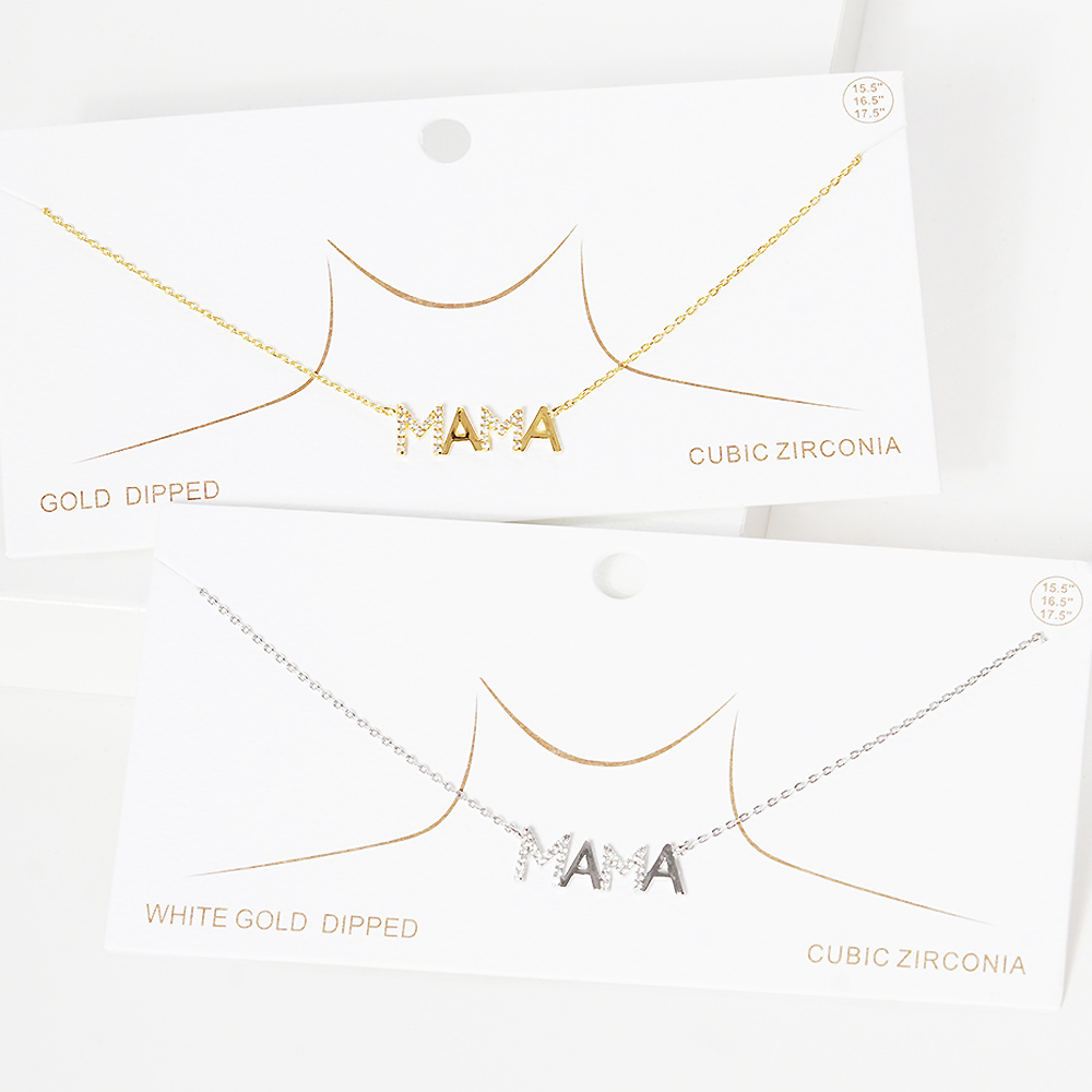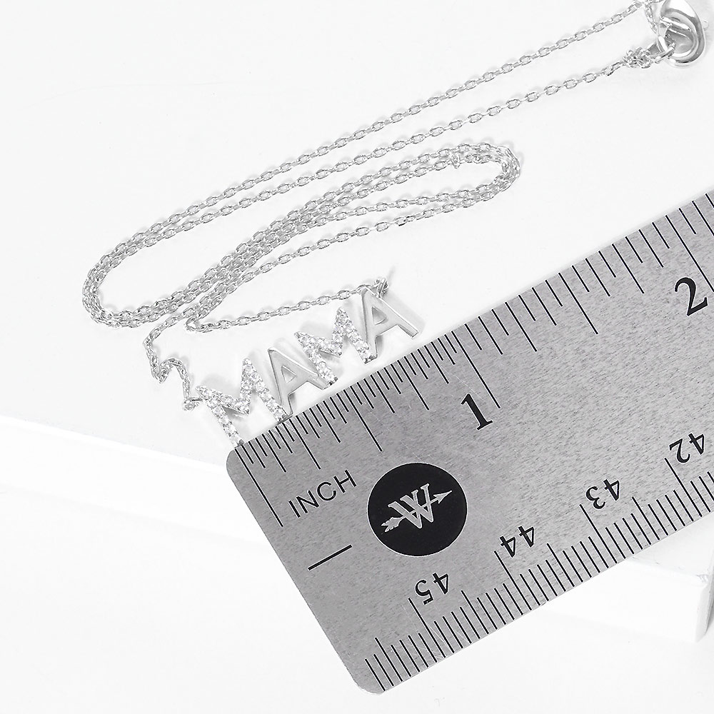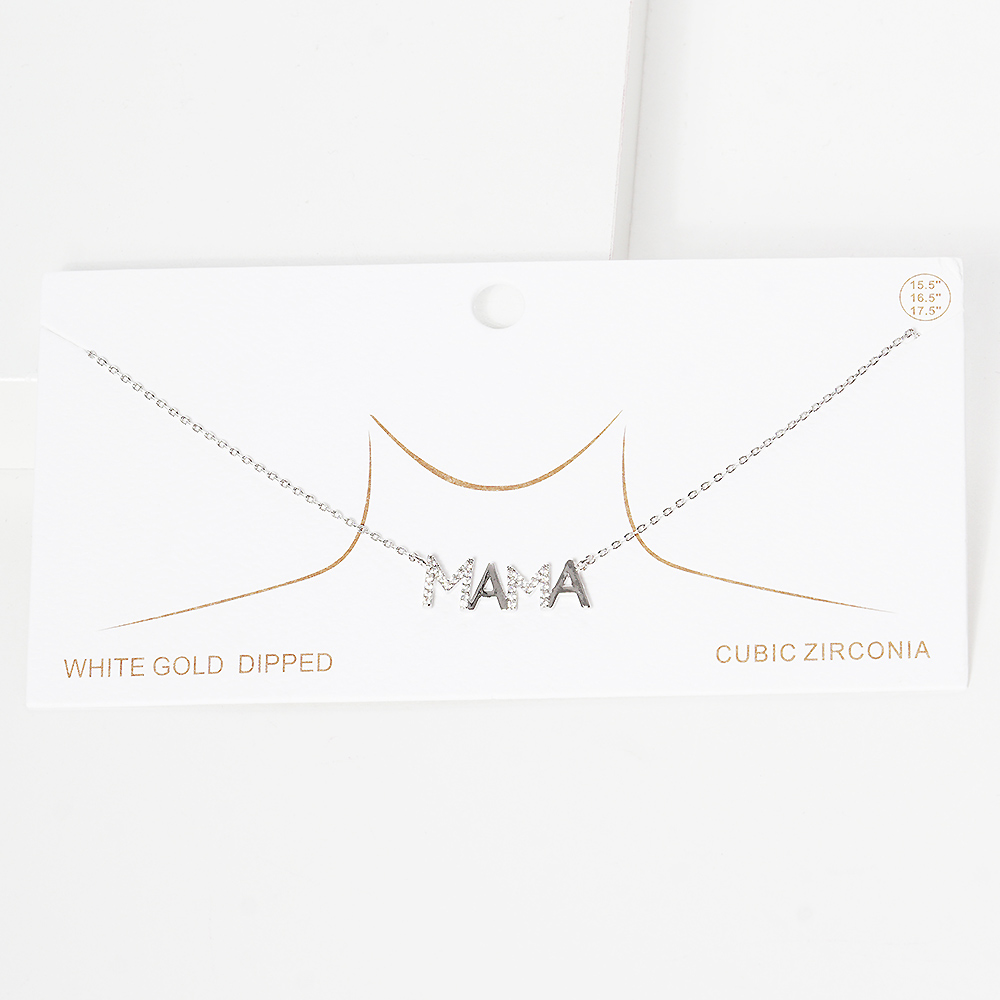 White Gold Dipped CZ Mama Metal Message Pendant Necklace