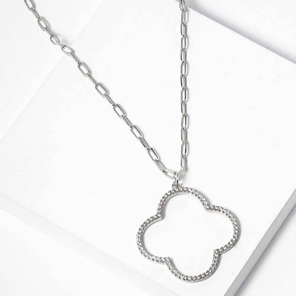 White Gold Dipped CZ Stone Paved Open Quatrefoil Pendant Necklace