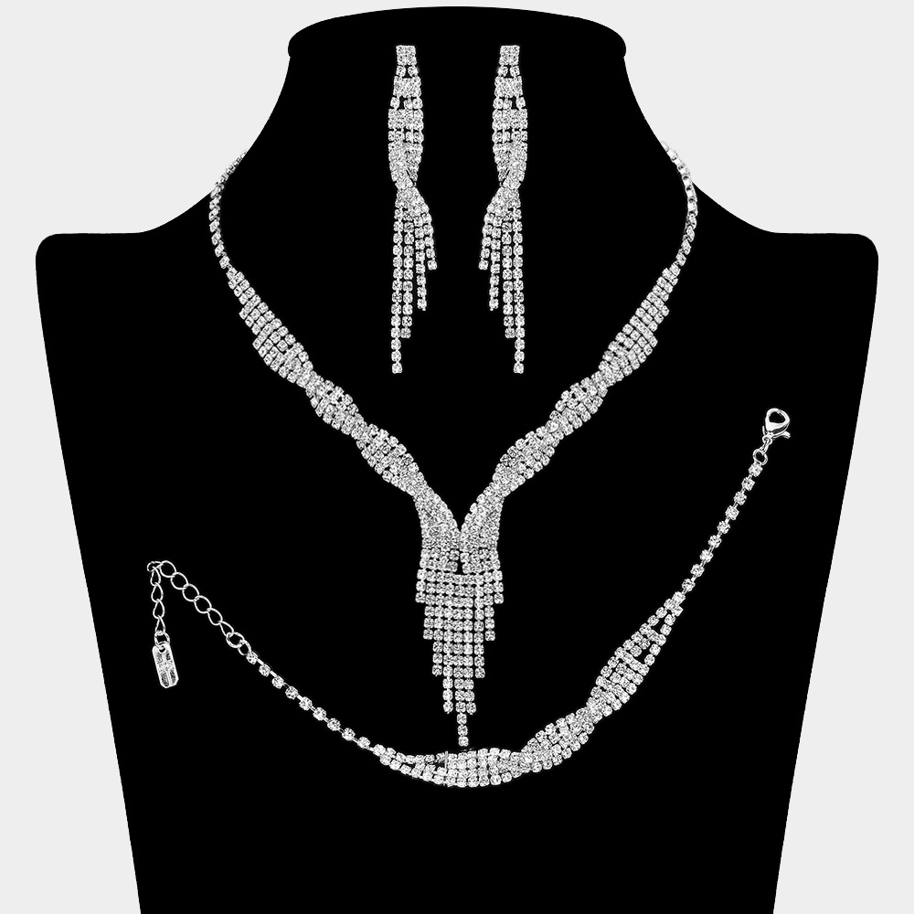 • Elevate your evening style with this luxurious gold-tone crystal jewelry set. Featuring a dazzling necklace, matching bracelet, and elegant drop earrings, this set adds timeless sparkle to weddings, proms, and formal occasions. Perfect for creating a glamorous and coordinated look.