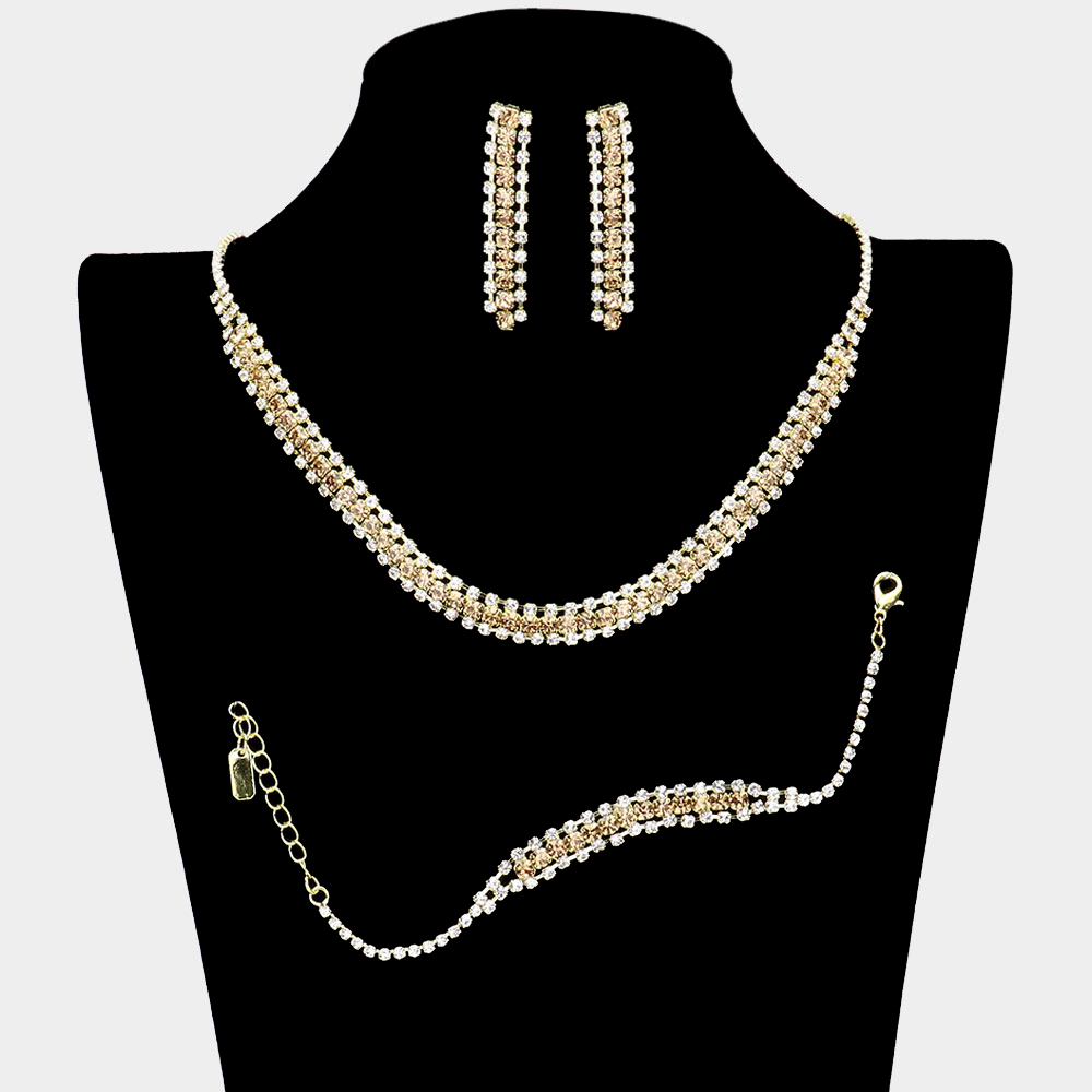 • Elevate your style with this elegant rhinestone jewelry set, featuring a sparkling necklace, matching bracelet, and drop earrings. Perfect for weddings, parties, or evening occasions, this coordinated trio adds timeless radiance and refined sophistication to any ensemble.