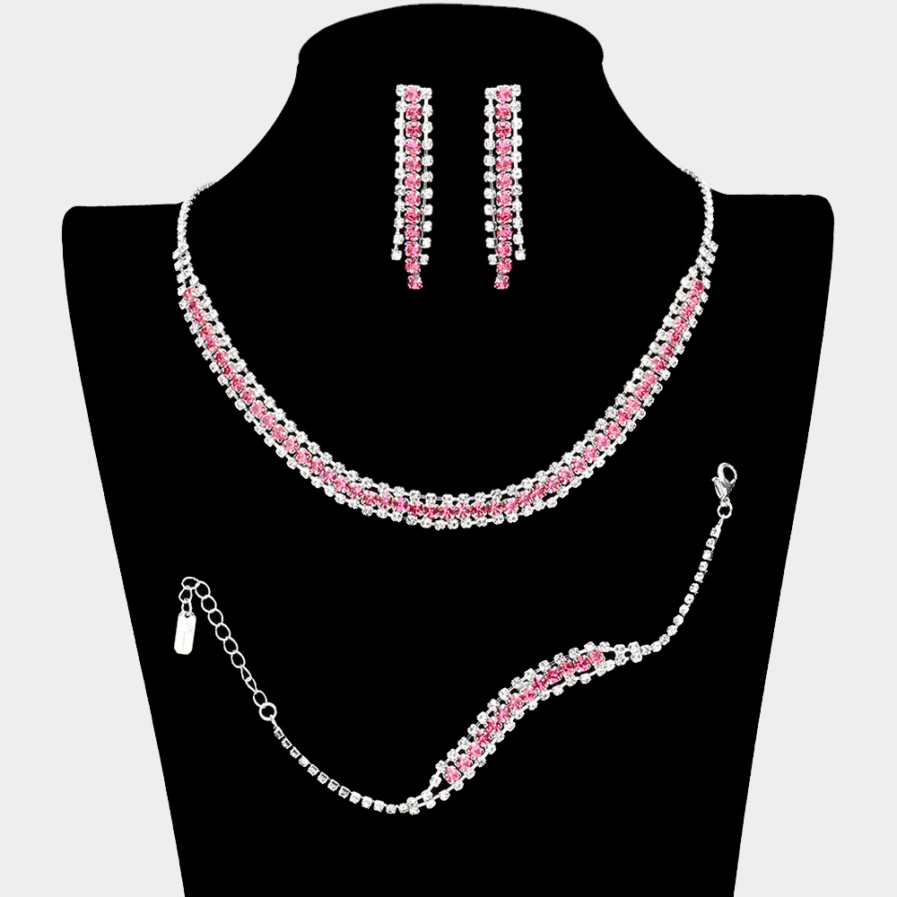 Details • Necklace Size : 16" + 4" L • Decor Size : 0.3" L • Bracelet Size : 0.3" H, 7" + 2" L • Earrings Size : 1.9" L • Elevate your style with this elegant rhinestone jewelry set, featuring a sparkling necklace, matching bracelet, and drop earrings. Perfect for weddings, parties, or evening occasions, this coordinated trio adds timeless radiance and refined sophistication to any ensemble.