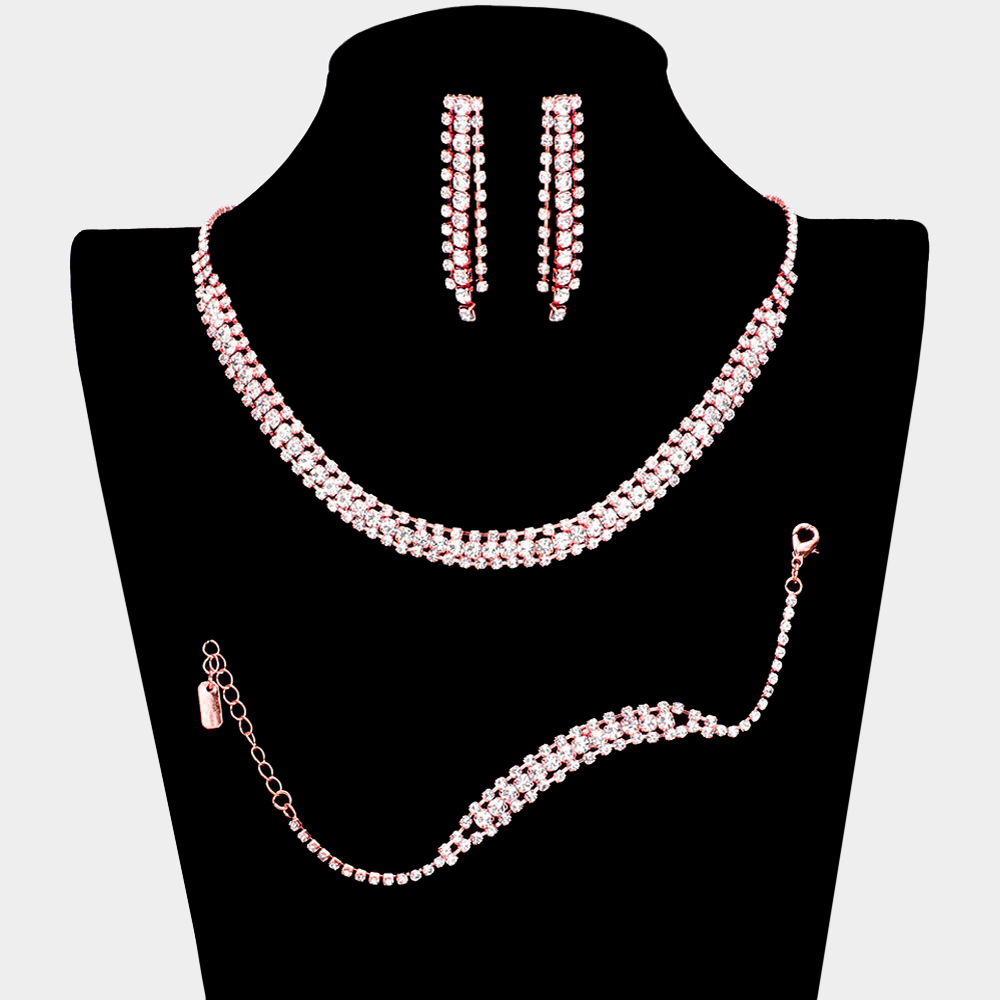 Details • Necklace Size : 16" + 4" L • Decor Size : 0.3" L • Bracelet Size : 0.3" H, 7" + 2" L • Earrings Size : 1.9" L • Elevate your style with this elegant rhinestone jewelry set, featuring a sparkling necklace, matching bracelet, and drop earrings. Perfect for weddings, parties, or evening occasions, this coordinated trio adds timeless radiance and refined sophistication to any ensemble.