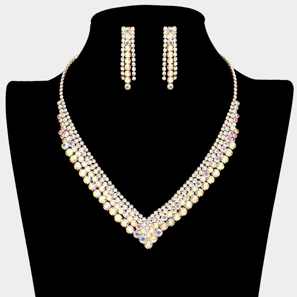 Details • Necklace Size : 16" + 4" L • Decor Size : 0.75" L • Earring Size : 1.6" L • Dazzling V-shaped necklace and matching drop earrings featuring shimmering rhinestones with a multi-layer design. Perfect for weddings, proms, and elegant evening looks, this jewelry set adds refined sparkle and sophistication, creating a timeless and radiant statement style.