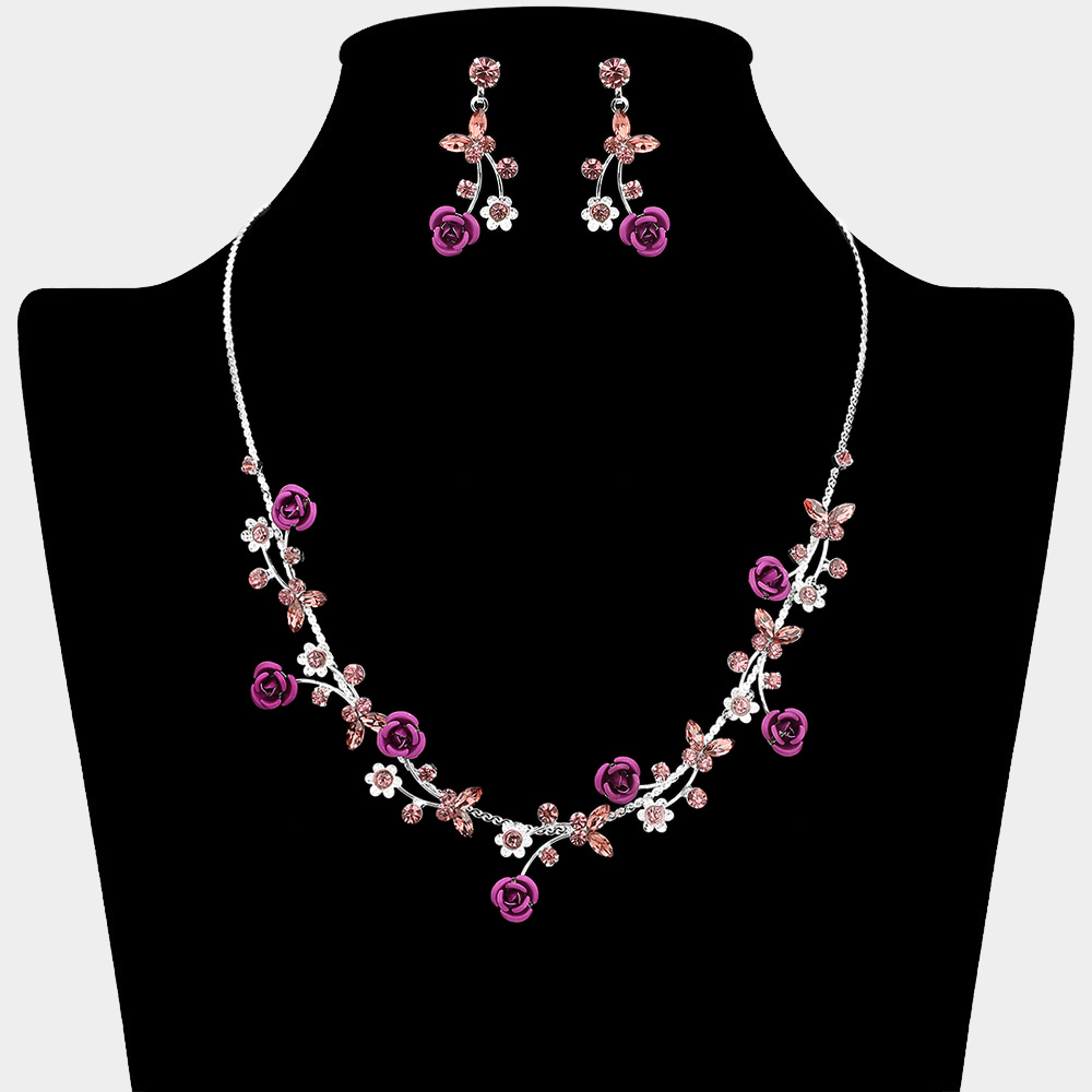 Details • Necklace Size : 16.5" + 5" L • Decor Size : 1" L • Earrings Size : 1.3" L • Elevate your style with this rose and floral necklace and earring set. Featuring delicate blossoms and sparkling accents, this elegant set is perfect for weddings, evening events, or adding a graceful charm to special occasions.