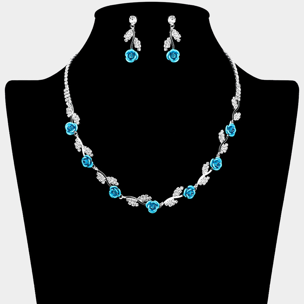 Details • Necklace Size : 15.5" + 4.75" L • Decor Size : 0.5" L • Earrings Size : 1.3" L • Showcase timeless elegance with this rose necklace and earring jewelry set. Featuring delicate floral details and a refined design, this set is perfect for weddings, formal occasions, or adding a graceful finishing touch to your evening style.