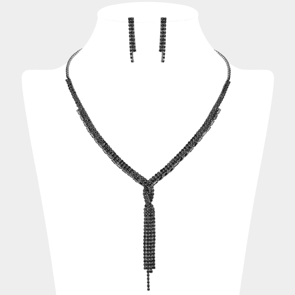 • Stylish Y-drop necklace and earring set featuring a cz rhinestone tassel pendant and matching linear earrings. The sleek, cascading design adds a touch of glamour, perfect for evening wear, parties, and formal occasions.