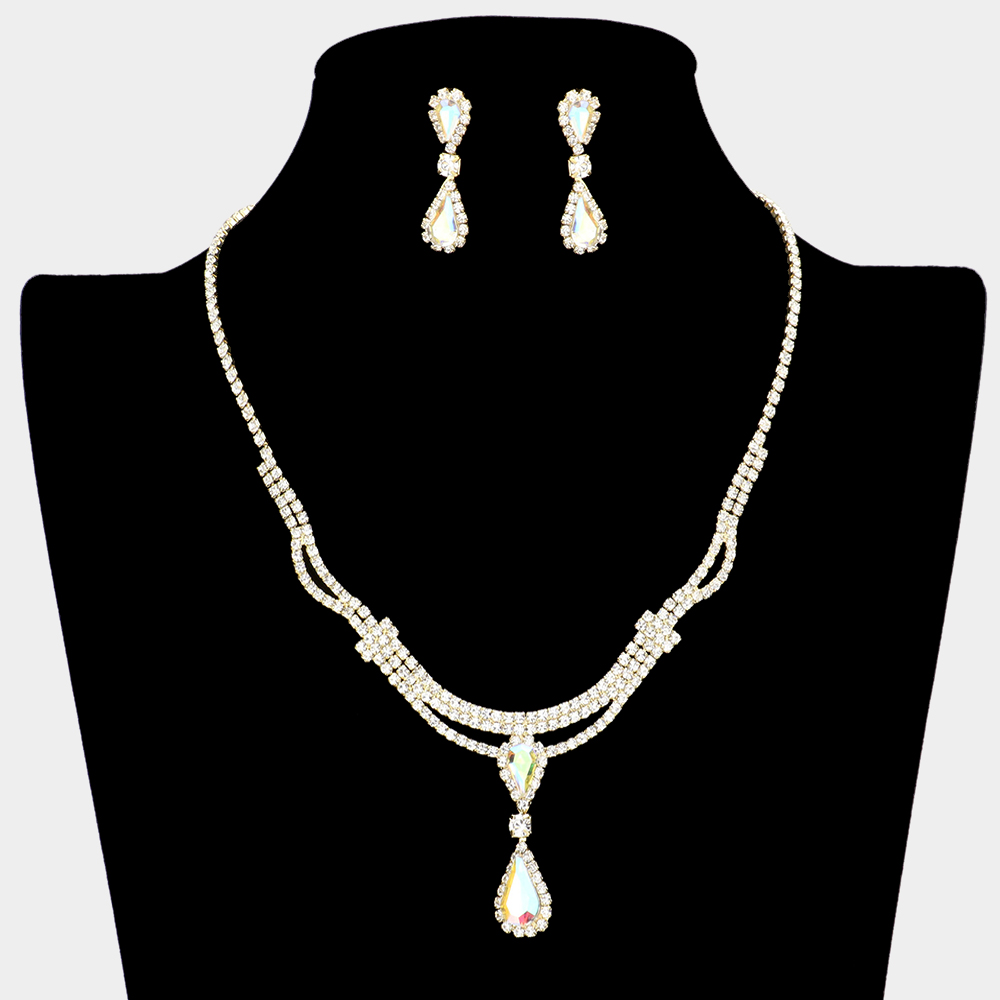 • Complete your bridal or evening look with this rhinestone teardrop necklace and earrings set. Featuring shimmering rhinestones and a double teardrop pendant design, this jewelry set adds timeless sparkle and sophistication, perfect for weddings, prom, and formal occasions.