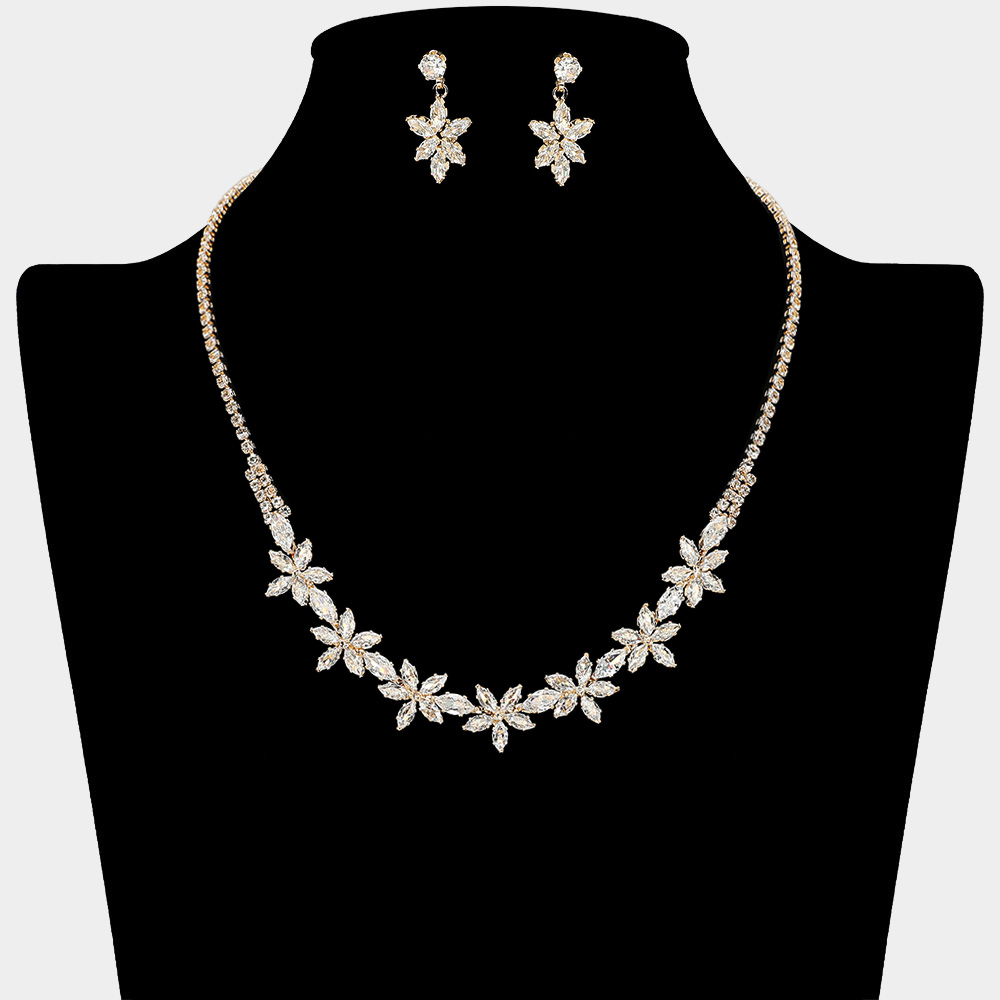 Details • Necklace Size : 16.5" + 4.75" L • Decor Size : 0.5" L • Earrings Size : 1" L • Enhance your style with this exquisite floral crystal jewelry set. Featuring a delicate necklace adorned with sparkling flower motifs and matching earrings, it’s ideal for weddings, proms, and evening events. Designed to add refined elegance and a timeless shimmer to any formal look. • CZ Cubic Zirconia