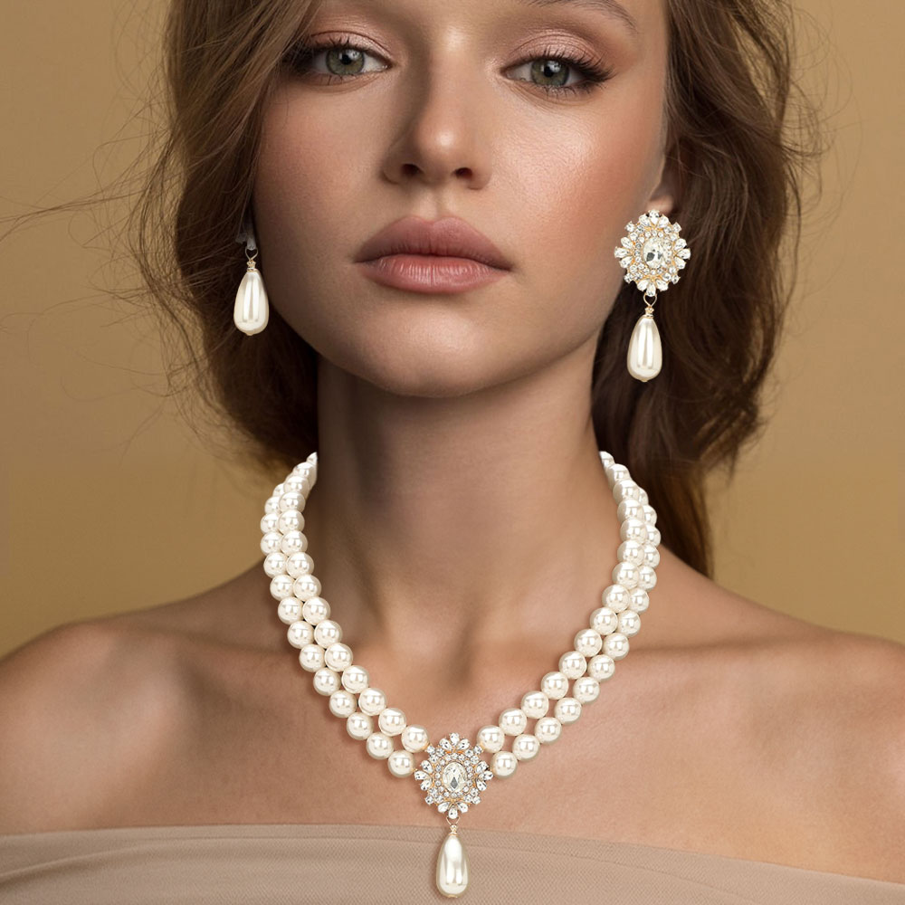 Details • Necklace Size : 15.5" + 3" L • Decor Size : 2.25" L • Earrings Size : 2.25"L • Shine with sophistication in this crystal pearl necklace and earring set featuring radiant pearls, sparkling crystal accents, and elegant teardrop pendants. Perfect for weddings, galas, or evening events, this timeless jewelry ensemble enhances any outfit with refined luxury and grace.