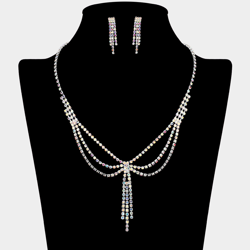 Details • Necklace Size : 16.5" + 4" L • Decor Size : 2.4" L • Earrings Size : 1.25" L • Elegant layered necklace and earring set featuring cascading rhinestone strands and a center tassel accent. The draped silhouette adds graceful movement, perfect for formal events, evening wear, or stylish special occasions. • Lead and Nickel Compliant