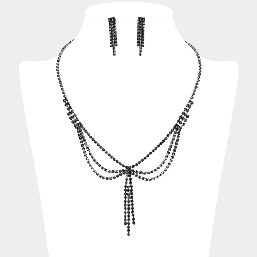 • Elegant layered necklace and earring set featuring cascading rhinestone strands and a center tassel accent. The draped silhouette adds graceful movement, perfect for formal events, evening wear, or stylish special occasions.