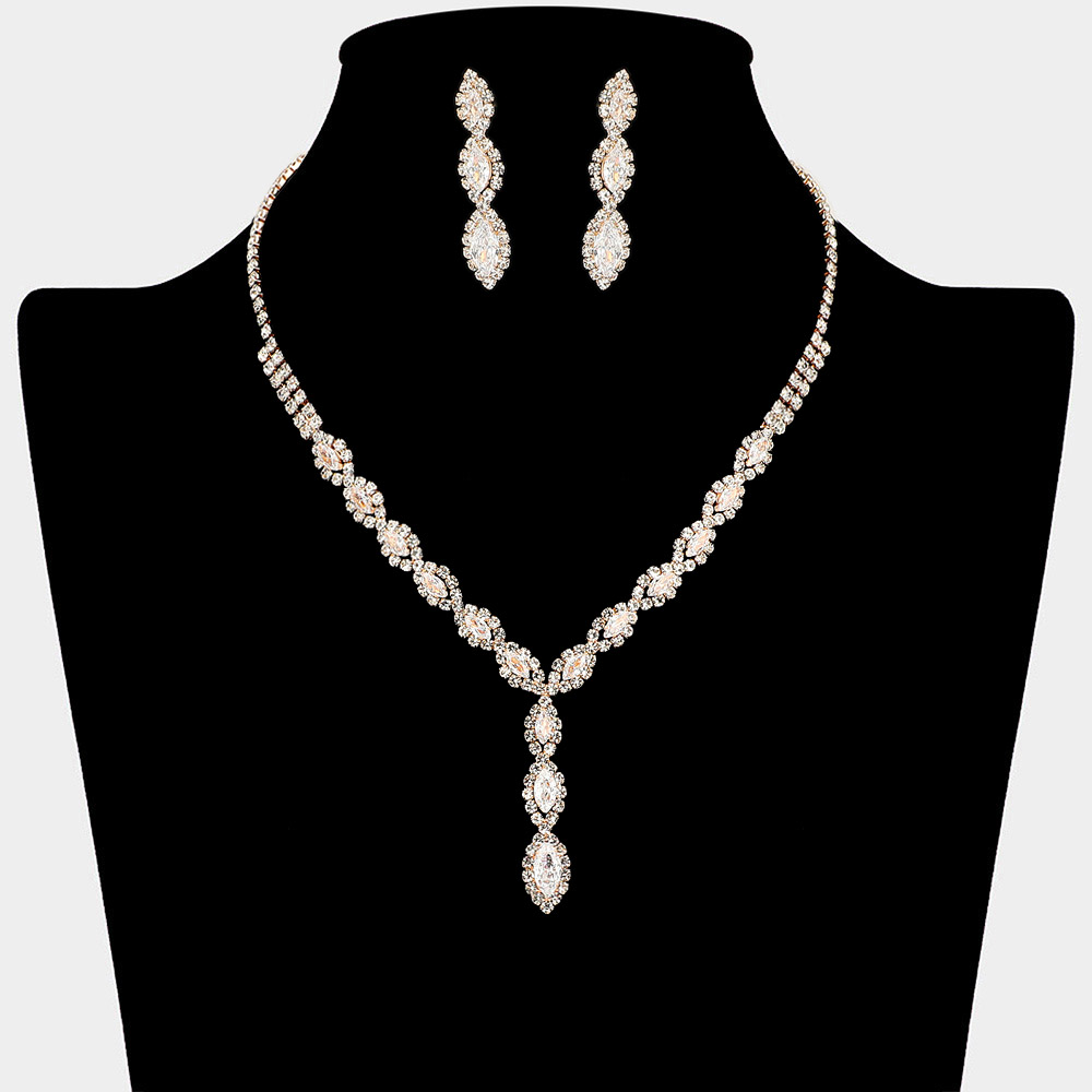 • Dazzling jewelry set featuring a V-shaped CZ stone necklace with marquise-cut clusters and matching drop earrings. Its symmetrical layout and elongated teardrop silhouette bring timeless elegance to evening, bridal, or formal looks.