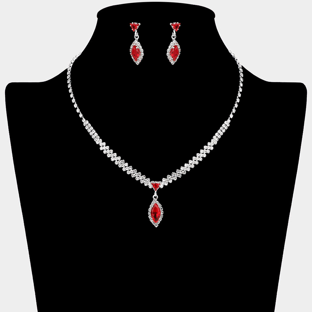 Details • Necklace Size : 14" + 5" L • Decor Size : 1.2" L • Earrings Size : 1" L • Elegant jewelry set featuring a crystal teardrop pendant necklace with matching earrings. The sparkling rhinestone accents and refined setting create a timeless look, perfect for weddings, evening events, or adding sophistication to any formal outfit. • CZ Cubic Zirconia • Lead and Nickel Compliant
