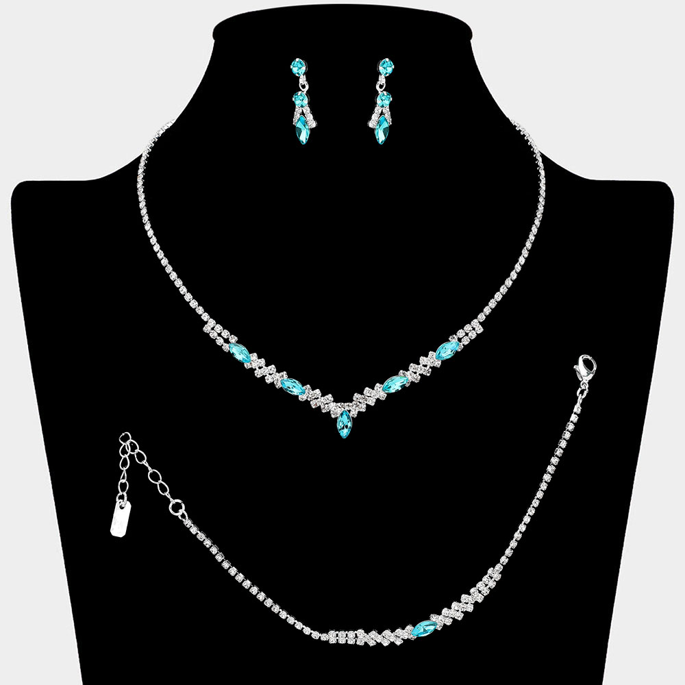 • Shine with timeless elegance in this crystal jewelry set featuring a delicate necklace, matching bracelet, and sparkling drop earrings. Designed with refined detailing, it adds a graceful touch to formal looks, perfect for weddings, galas, or special evening occasions.